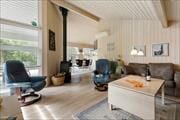 Så snart du træder ind i sommerhuset, mærker du, hvordan roen sænker sig. Det store vinduesparti i opholdsrummet trækker naturen med helt ind i stuen, og de lyse lofter til kip skaber luft og rummelighed, mens den varme glød fra brændeovnen indbyder til hyggelige timer med spil, snak og nærvær. Indretningen er enkel og venlig, med et åbent køkken-alrum, hvor du nemt kan kokkerere feriens måltider uden at gå glip af selskabet. På hemsen kan børn eller teenagere trække sig tilbage med en film, og to badeværelser – det ene med både spa og sauna – sikrer, at hele familien kan forkæles efter en lang dag ude i det fri. Her får du en feriebolig, hvor det er nemt at føle sig hjemme.