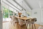 Sommerhuset er lyst, indbydende og indrettet i en charmerende nordisk stil, der skaber en hyggelig atmosfære. Hjertet af huset er den rummelige opholdsstue, hvor store vinduespartier trækker naturen helt tæt på. Her kan du slappe af i sofahjørnet, samle familien om et brætspil eller nyde en hyggelig middag ved spisebordet. Hvis vejret viser sig fra sin mindre sommerlige side, kan du lune dig foran brændeovnen eller hoppe en tur i husets indendørs swimmingpool, der sikrer badeglæde hele året rundt. Efter en lang dag i naturen kan du forkæle dig selv med et afslappende spabad eller en tur i saunaen, der sætter prikken over i'et på en velvære-fyldt ferie.