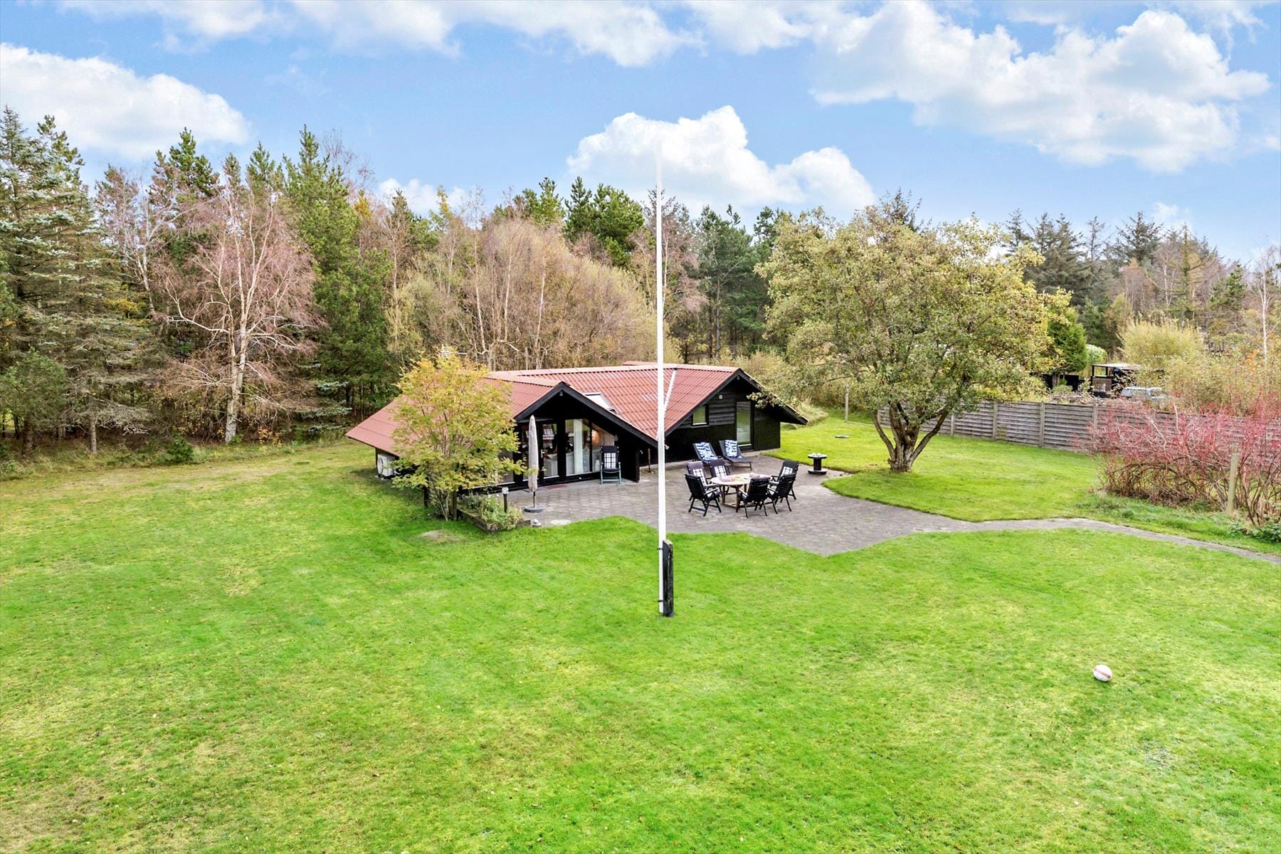 Huset ligger på en stor, ugeneret grund, der er et paradis for både børn og voksne. Den rummelige have inviterer til leg og afslapning – her kan børnene bygge sandslotte i sandkassen, spille fodbold eller riste skumfiduser ved bålpladsen, mens de voksne nyder solen fra en af de mange havemøbler. Den overdækkede terrasse gør det muligt at tilbringe tid udenfor uanset vejret, og på lune aftener kan middagen tilberedes på grillen, mens fuglesangen danner baggrundsmusik. Dyrelivet omkring sommerhuset er rigt, og du kan nemt få øje på både rådyr og fugle, der besøger den fredelige have.