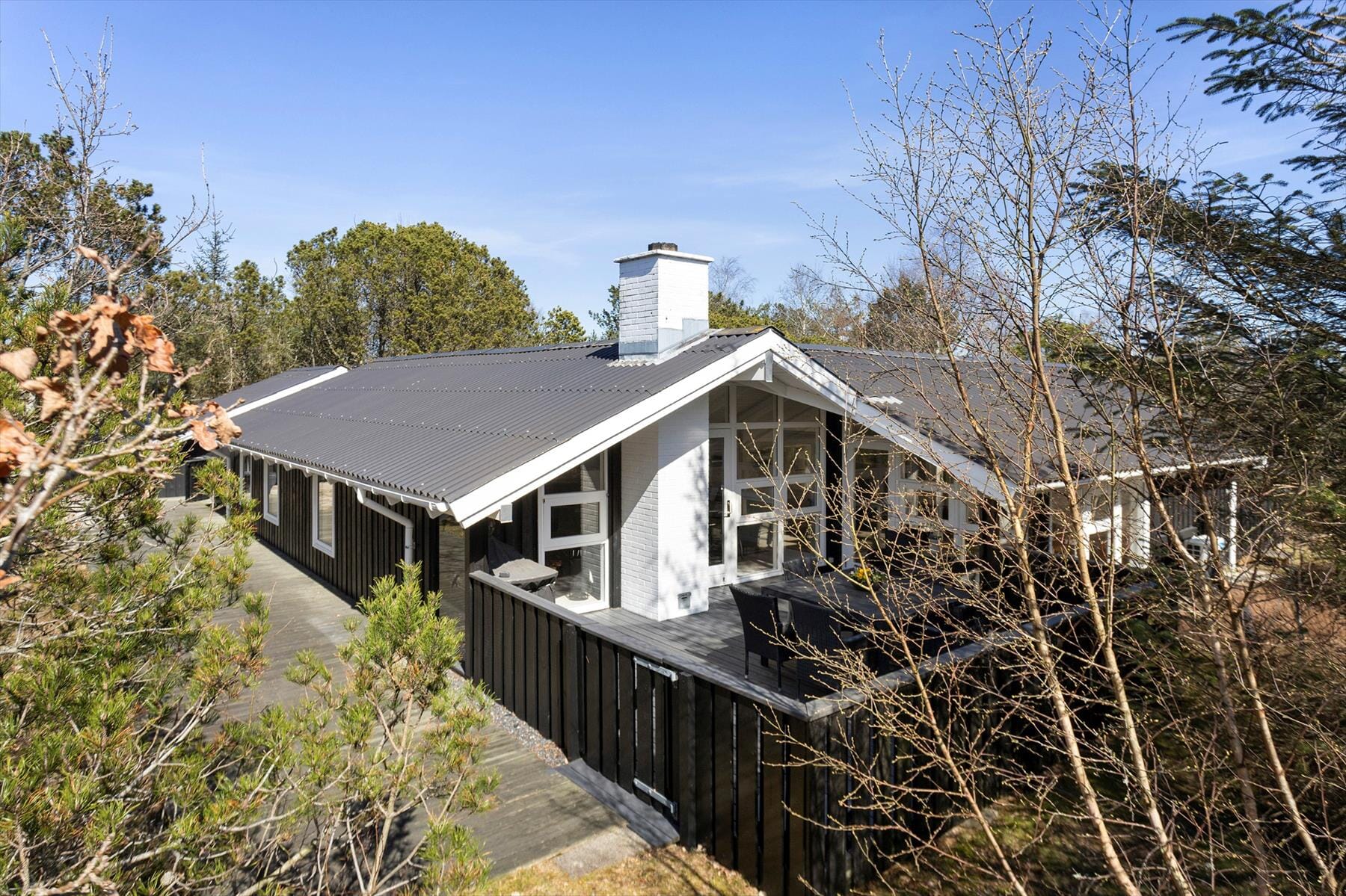 Udenfor venter skønne terrassearealer, der indbyder til lange, afslappede dage under åben himmel. Her kan du finde din favoritplads i solen, læne dig tilbage med en god bog eller samle familien til hyggelige måltider i det fri. Terrassen og grunden er delvist indhegnet, hvilket skaber en dejlig, afskærmet og privat atmosfære, hvor du kan slappe helt af. Når aftenen falder på, og duggen begynder at lægge sig, kan du tænde op i bålfadet og samle familien omkring de knitrende flammer. Her er der tid til snobrød, gode historier og den helt særlige feriestemning, som kun opstår, når mørket sænker sig, og stjernerne tændes på himlen.