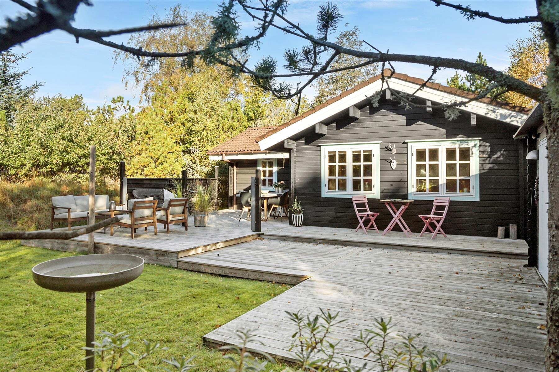 Sommerhuset ligger dejligt fredfyldt på en lukket vej, der grænser op til et skovklædt areal. Omkring huset vokser der også træer på naturgrunden, og et dejligt terrasseområde breder sig mod syd: Her kan du sidde i rolige og ugenerede omgivelser, mens du drikker formiddagskaffe i solen eller får en middagslur i skyggen af en parasol. Om aftenen kan du tænde op i grillen og gøre klar til et sommerligt måltid under åben himmel – og mens I sidder her og nyder maden, bliver I sikkert underholdt af områdets fugle, der synger deres aftensang fra toppen af træerne.