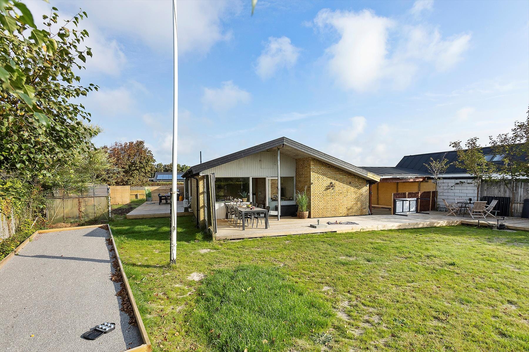 Udenfor fortsætter ferieidyllen i den lukkede have, hvor både store og små kan finde noget at glæde sig til. Terrasserne byder på solrige pletter og skyggefulde kroge, så du kan nyde din morgenkaffe i fred og ro, servere frokosten under åben himmel eller grille aftensmaden, mens duften breder sig i sommeraftenen. Haven er ideel til leg – her er legeredskaber til børnene og en petanquebane, som garanterer gode timer for de voksne. Har du hund med på ferie, kan du også roligt slippe den løs i de trygge rammer, hvor græsplænen giver masser af plads til leg og løb. Når solen går ned, er det oplagt at trække tæppet om skuldrene, tænde stearinlys og nyde den fredelige stemning, der kun findes i en have på en lys sommeraften i Nordjylland.