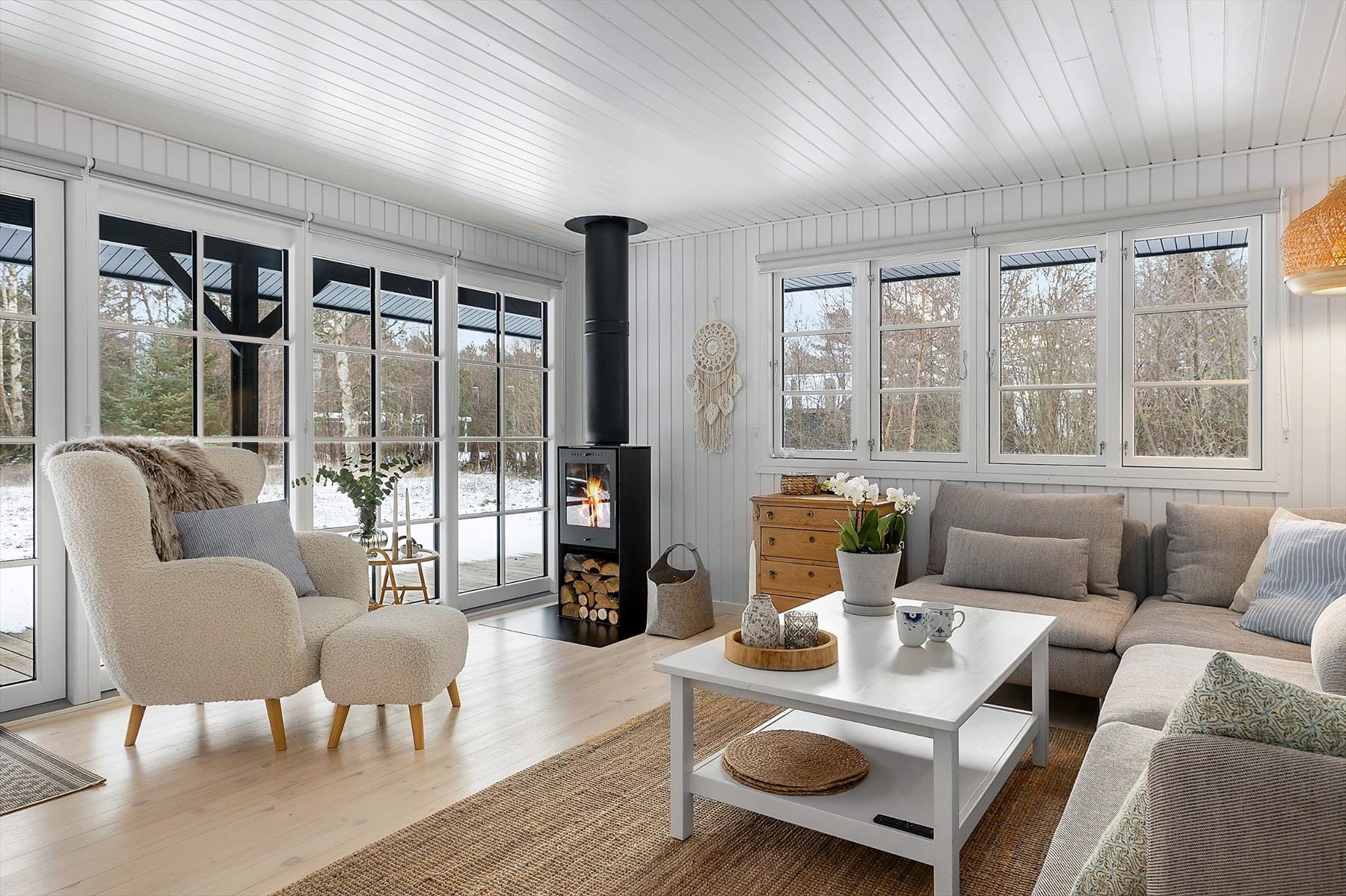 Når du træder indenfor, møder du et sommerhus, der i 2025 er blevet totalrenoveret med stor omtanke for både komfort og klassisk sommerhusstemning. De lyse materialer, varme trædetaljer og den nordiske stil skaber en let og behagelig atmosfære, som gør det nemt at finde ro. I den hyggelige stue kan du synke ned i sofaen, mens flammerne knitrer i den nye brændeovn – en perfekt ramme om langsomme morgener eller stille aftener efter en dag fyldt med oplevelser. Køkkenet fremstår moderne og indbydende, så du kan tilberede alt fra morgenpandekager til aftensmad i fælles selskab. Badeværelset er totalrenoveret fra A til Z – et moderne og lækkert rum med elegante fliser, kvalitetsinventar og godt lys, der giver en komfortabel og behagelig start på dagen. Annekset udenfor giver desuden ekstra muligheder for at trække sig tilbage til en fredelig oase. Her kan alle finde deres foretrukne hjørne til afslapning, samvær og feriehygge.