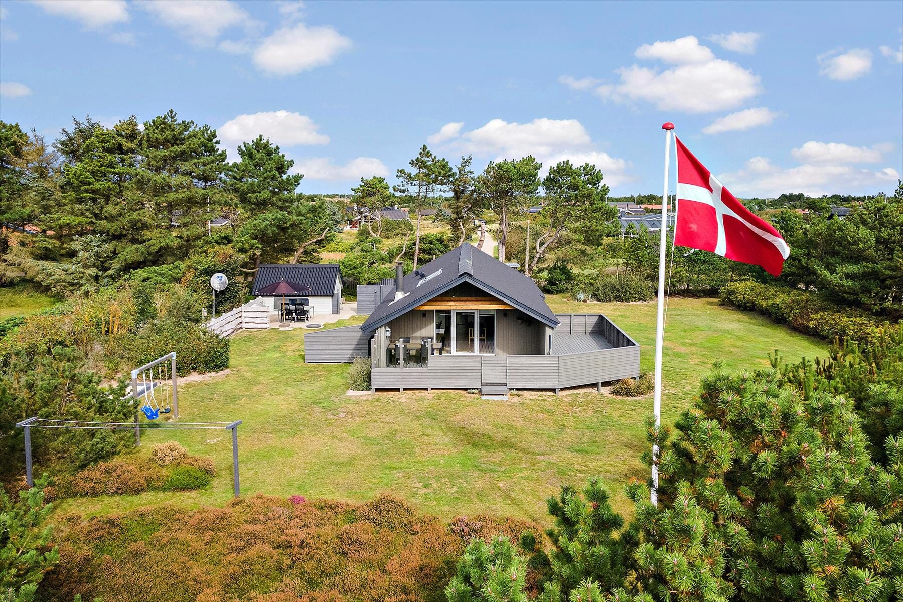 Fra stuen har I direkte adgang til en delvist overdækket og helt aflukket terrasse, hvor I har rig mulighed for at finde en solrig siddeplads det meste af dagen. På vestsiden af huset finder I yderligere to mindre terrasser, der ligger dejligt ugeneret i en krog af baghaven. Foran huset breder en stor græsplæne sig, så der er god plads til at spille bold og slå kolbøtter. De yngste børn kan for øvrigt hygge sig i sandkassen og på gyngen – det skulle gerne give de voksne tid til at nå en kop kaffe mere, inden det er tid til at komme op af havestolene.