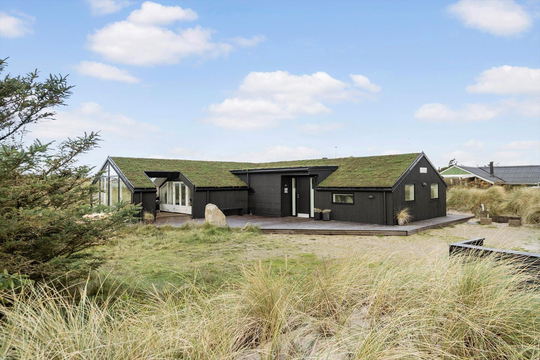 En overdækket terrasse, som også er lukket af mod tre sider, bygger en skøn bro mellem inde og ude, og her kan I sidde i læ, selvom vestenvinden blæser. Samtidig har I åbne terrasser omkring huset, hvor I kan trække med solen rundt fra morgen til aften. Lystfiskere vil glæde sig over den udendørs fiskerenseplads, og der er en stor fryser i skuret. Den udendørs tøndesauna har panoramaudsigt til det tilstødende klitlandskab, og når solen synker ned bag klitterne I vest, kan I nyde synet fra den hyggelige bålplads.