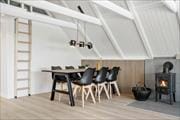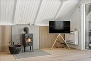 Efter totalrenoveringen præsenterer rummene sig på lys og indbydende vis. Planløsningen fungerer godt til seks personer, for to dejlige soveværelser ligger side om side, og fra stuen fører en stige op til en hems med ekstra sovepladser. Hoveddøren fører ind til et pænt og praktisk bryggers med vaskemaskine og god plads til sko og overtøj. Selv på badeværelset får I en dejlig ramme om morgenbrusebadet, og når familien vil hygge sig sammen, kommer det til at foregå i det skønne opholdsrum, hvor køkken og stue er forenet. Her er der loft til kip, hvidmalede hanebjælker og brændeovn, og det store vinduesparti i gavlen lader sollyset og de smukke naturomgivelser strømme ind.