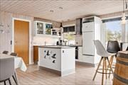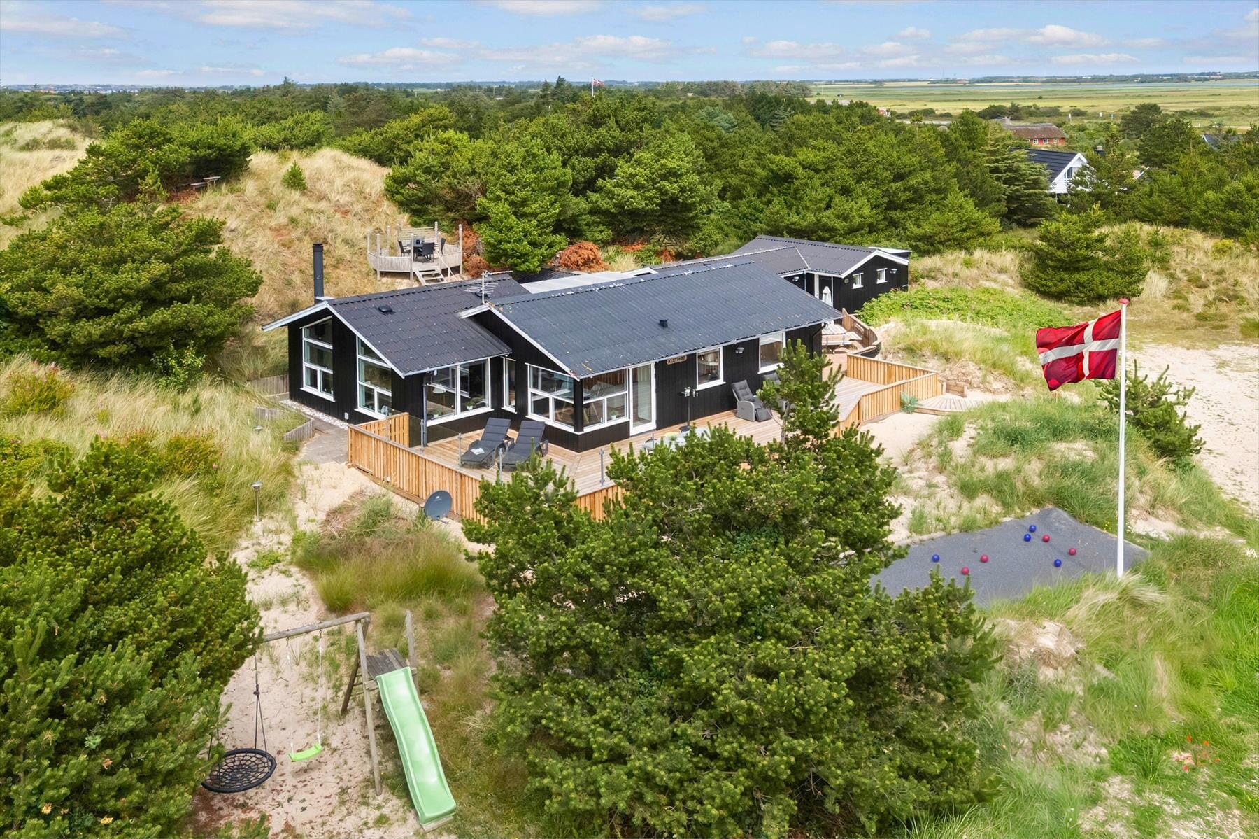 Når I har tryllet noget lækkert frem i køkkenet, kan I også rykke måltidet ud på de dejlige terrasseområder, der breder sig ved huset. Der er også en grill til rådighed under halvtaget, hvor I desuden finder en praktisk fiskerenseplads, så I kan gøre dagens fangst klar til at komme i fryseren eller på grillen. Takket være beplantningen og den kuperede naturgrund ligger udearealerne nær huset dejligt ugeneret, og hvis det er en smuk udsigt, I er ude efter, kan I sætte jer op den solrige platform eller bænken længere oppe ad klitten. På grunden får I desuden glæde af en udendørsbruser, en petanquebane og et legestativ med sansegynge, og så er der gode parkeringsforhold til bilen.