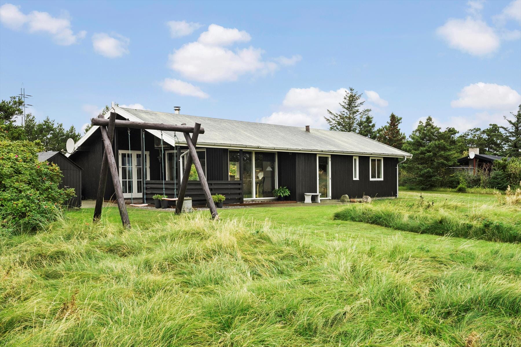 Fra stuen er der direkte adgang til et øst- og sydvendt terrassemiljø med en overdækket og en åben del. Her kan I nyde feriedagene i solen dagen lang, og under overdækningen kan I finde både ly og læ, når I vil grille om aftenen. Fra udearealerne har I et skønt udsyn til mark, eng og fjord. De yngste har god plads til leg, og her er både et gyngestativ og en sandkasse.