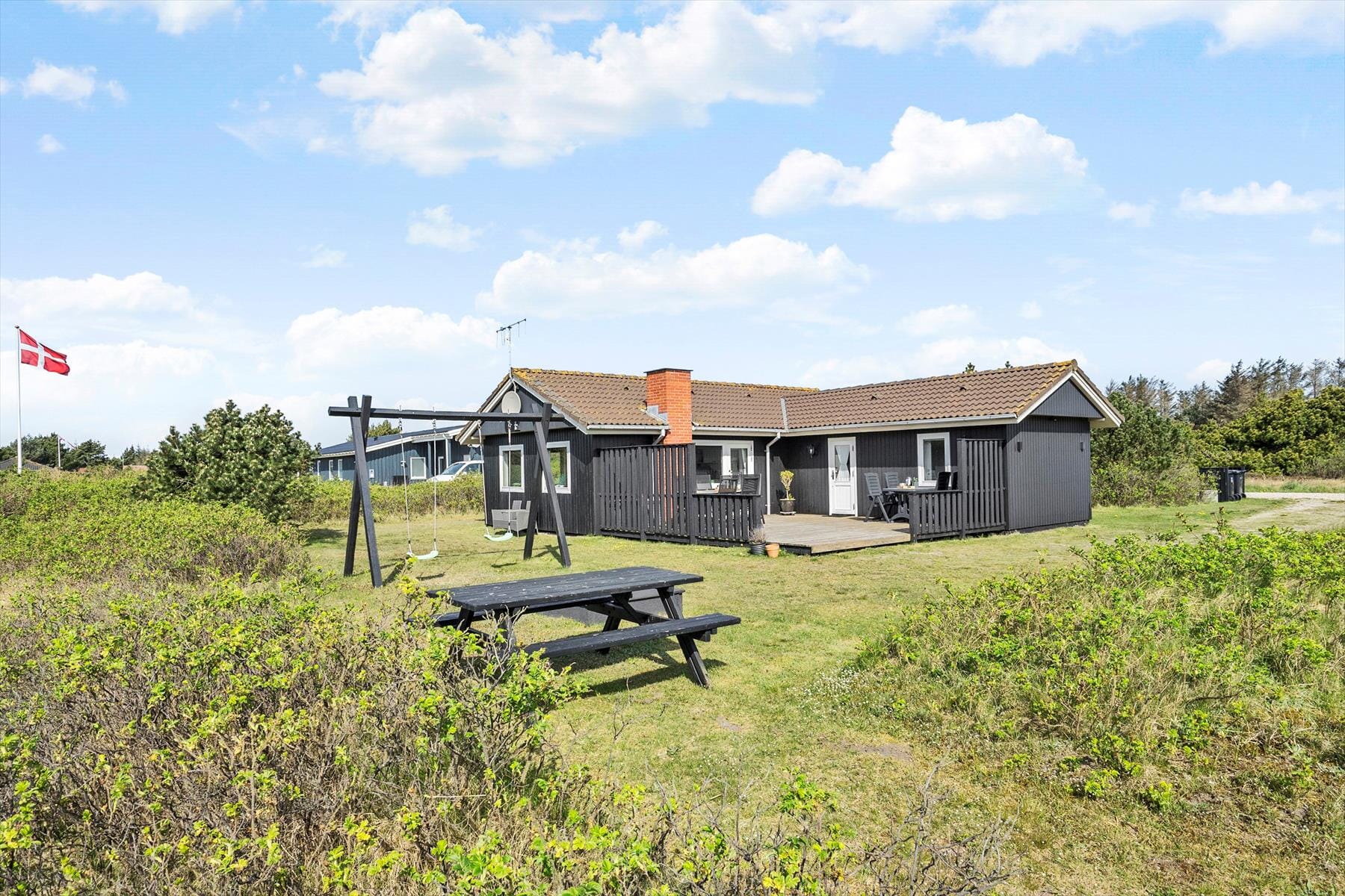 Den sydvendte træterrasse ligger godt i læ for ve­sten­vin­den, og her har I det ideelle sted at servere dagens måltider i solen eller bare slappe af i lig­ge­sto­le­ne. Grunden byder på gode mu­lig­he­der for leg, for her er både et gyn­ge­sta­tiv, en sandkasse og en fod­bold­ba­ne. En udendørs fi­ske­ren­se­plads samt et in­te­gre­ret skur med fryser gør fe­ri­e­hu­set ideelt til lyst­fi­ske­ren. Samtidig er her et aflåst skur med plads til at opbevare cykler, fiskestænger eller surfgrej.