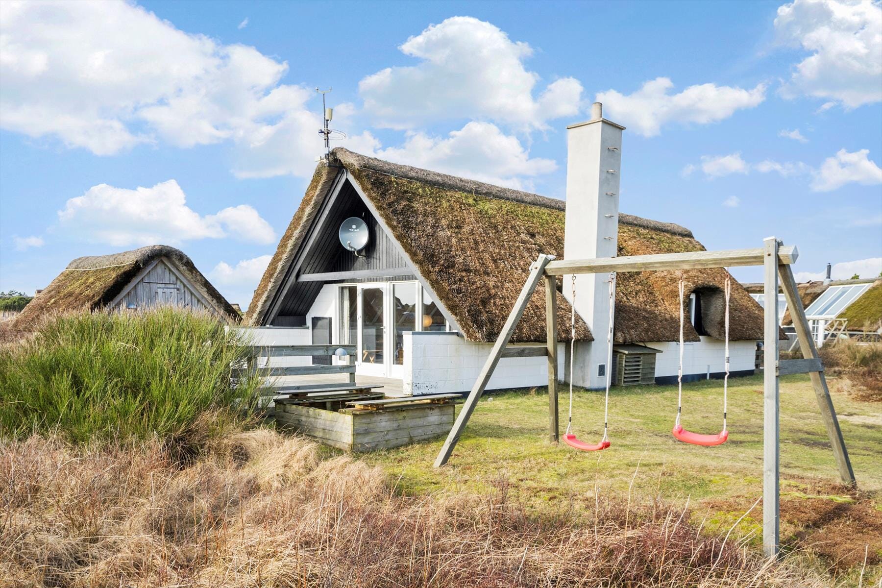 Sommerhusets store træterrasse ligger godt i forhold til solen, så du kan nyde det gode vejr fra morgen til aften i bekvemme rammer. Bliver du tørstig, er det nemt at smutte ind for at hente et glas vand eller en varm kop kaffe i køkkenet, og måltiderne kan selvfølgelig også oplagt flyttes ud i det fri. Når du sidder her, kan du se Lyngvig Fyr knejse i det fjerne over Holmsland Klits sommerhuslandskab, og helt tæt på kan du nyde duften og synet af lyng og anden bevoksning på husets store naturgrund. Nær terrassen er der gyngestativ og sandkasse til familiens yngste medlemmer.