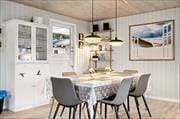 Skal I holde ferie med børn, vil sommerhuset give jer en skøn ramme om både leg og hyggestunder. Der er også tænkt på de praktiske detaljer, for i entréen er der vaskemaskine og en pusleplads til de alleryngste feriegæster, og så hører der både et gæstetoilet og et badeværelse med til planløsningen. Netop badeværelset fortjener et par ekstra ord med på vejen, for her bliver I forkælet med både spabad og sauna, så I kan afslutte feriedagen med tilbagelænet wellness. Alternativt kan I tænde op i stuens brændeovn, lave te eller kaffe i det åbne køkken og gøre klar til en rolig stund i hjørnesofaen.