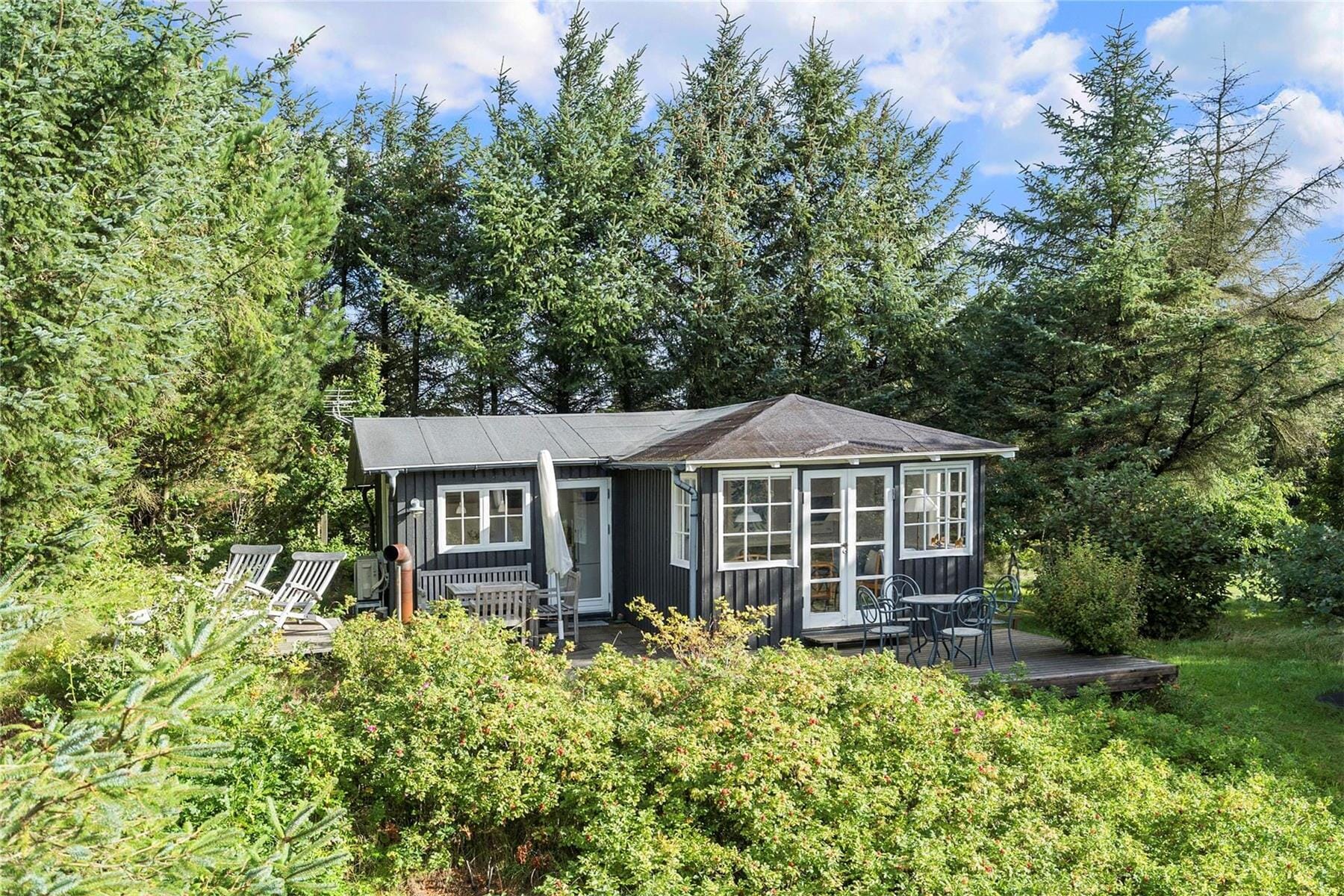 Fra både stuen og køkkenet har I direkte udgang til sommerhusets sydvendte terrassemiljø. Sanserne vækkes, når fuglene kvidrer fra trætoppene, hybenbuskene dufter, og I mærker en svag brise i sommersolen. Fra udsigtspladsen har I det flotteste vue over kysten og vandet, og der er havemøbler, liggestole, parasol og grill til rådighed, så der er lagt op til mange skønne afslapningsstunder.