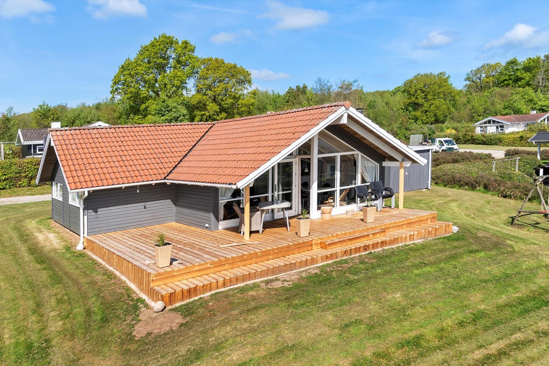 Sommerhuset er indrettet i en lys og indbydende stil, hvor store vinduespartier sikrer et dejligt lysindfald og forbinder inde- og udeliv. Det åbne køkken-alrum danner rammen om hyggelige stunder med familien, og herfra har du direkte adgang til terrassen. Stuen er indrettet med komfortable møbler, der indbyder til afslapning efter en dag i naturen. Soveværelserne er indrettet med gode senge, så du kan vågne veludhvilet op til en ny feriedag. Badeværelset er lyst og rummeligt, og huset byder desuden på spa og sauna, hvor du kan forkæle dig selv med wellness i ferien.