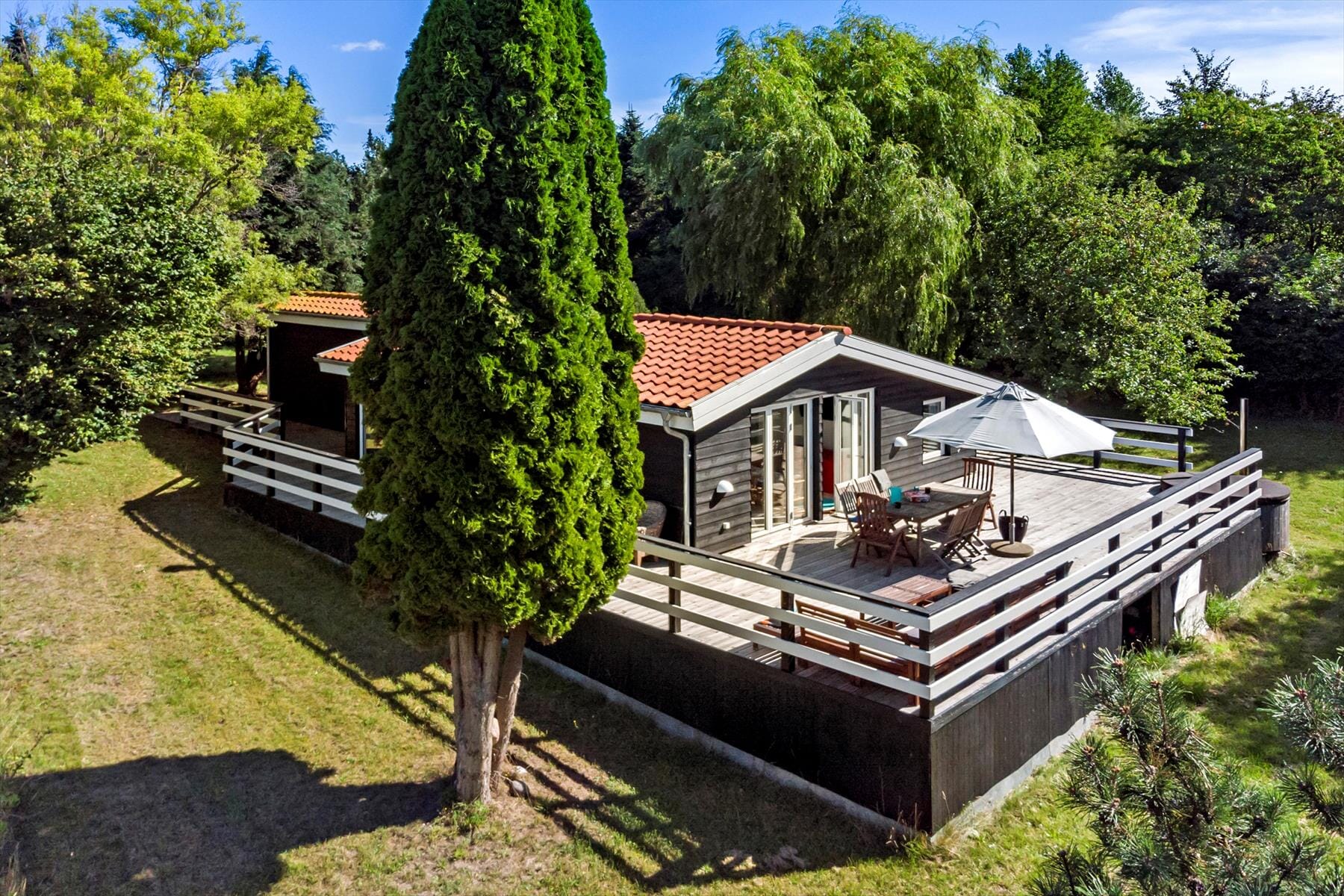 På træterrassen er der havemøbler.