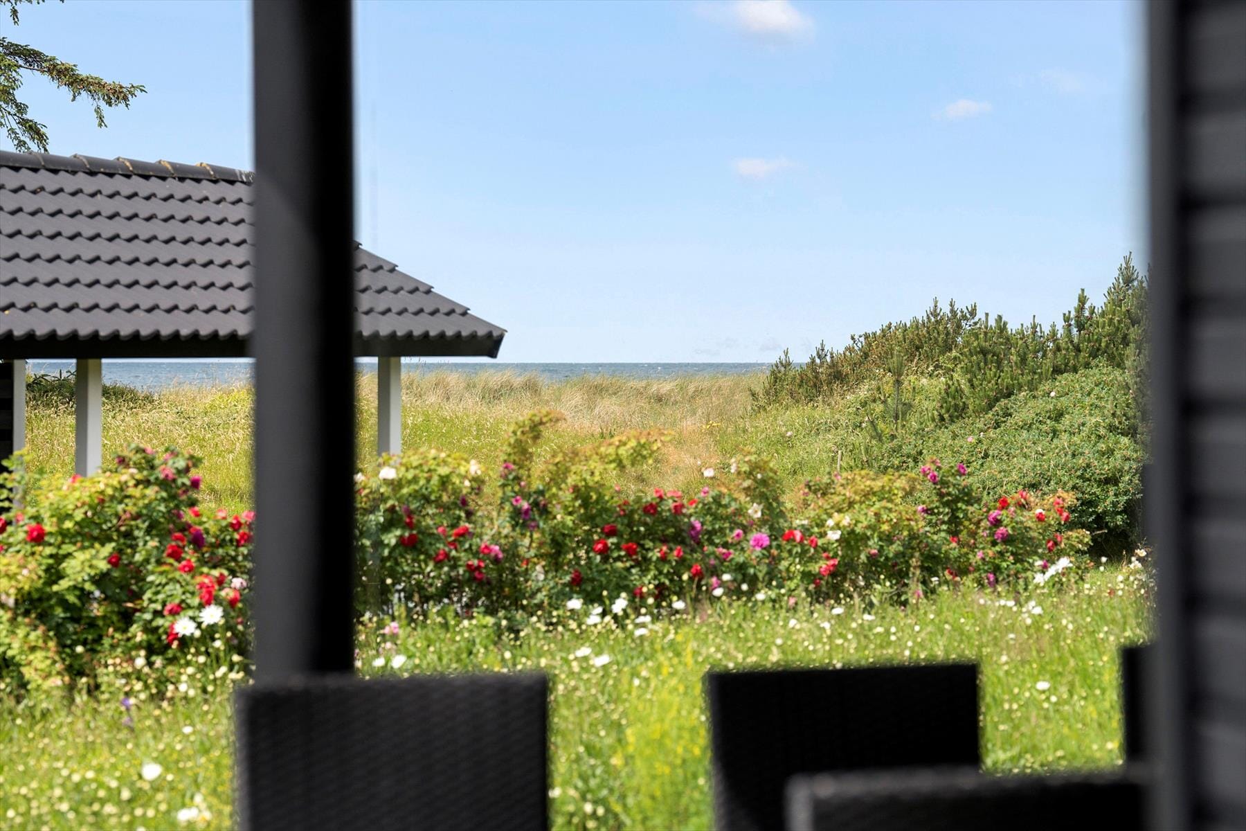 Fra stuen er der direkte udgang til delvis overdækket træterrasse og her kan I nyde de lune dage og aftener. Når mørket sænker sig, kan I trække ind under den overdækkede del af terrassen og nyde stilheden og nattehimlen med et glas vin eller en kop kaffe. I haven er der en nedsænket trampolin til ungerne. Ferien her indbyder til dage på stranden med badning og naturoplevelser.