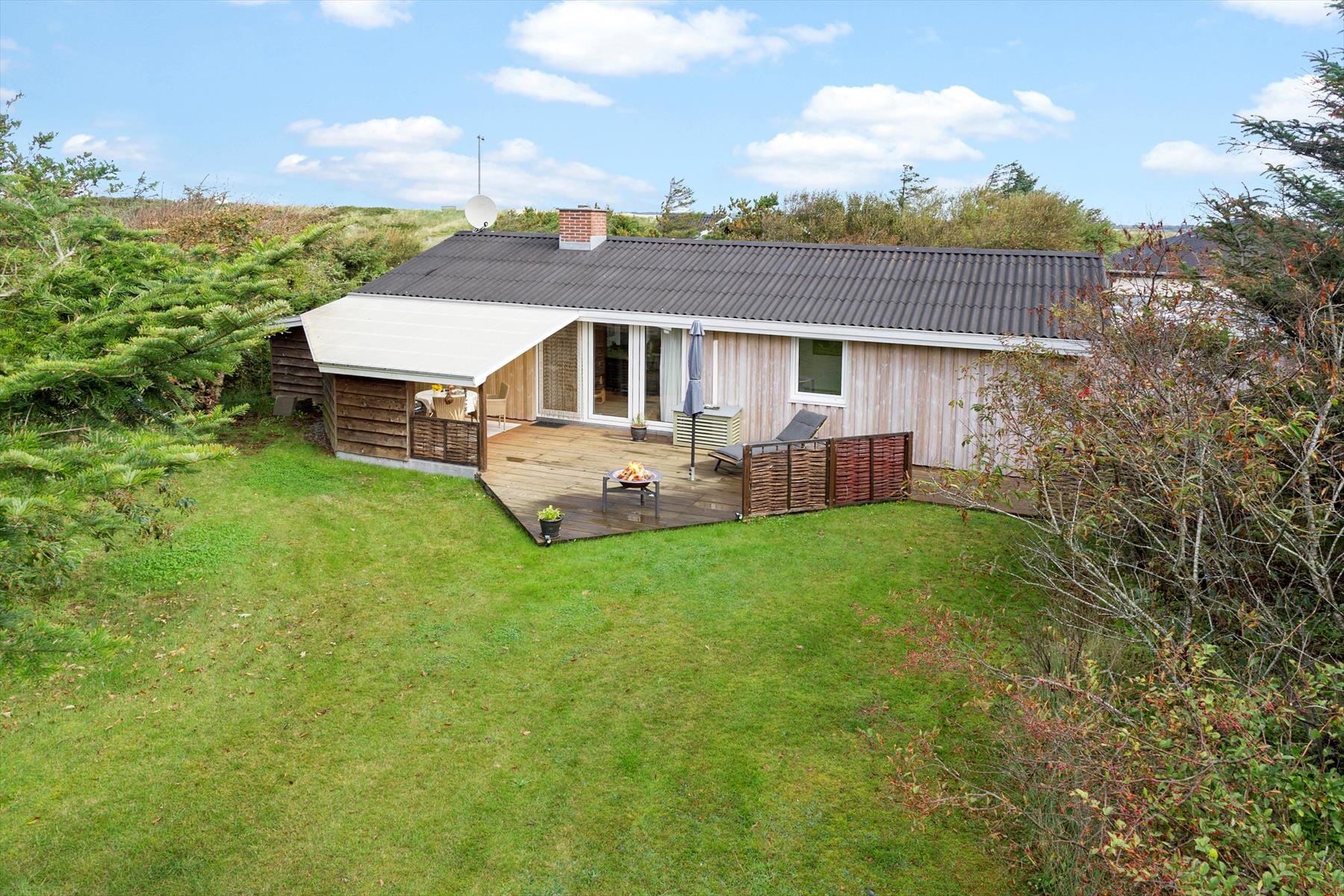 Udenfor venter den lækre terrasse, der giver jer de perfekte rammer til lange sommerdage og lune aftener i det fri. Start dagen med friskbrygget kaffe i solens første stråler eller nyd en lækker middag med lyden af naturen omkring jer. Terrassen er rummelig og veludstyret til afslapning, og grunden giver plads til både leg og for dybelse. Her kan børnene spille bold på græsset, mens du læser en god bog eller blot nyder roen i det grønne. Beliggenheden tæt på Vesterhavet betyder, at du nemt kan tage en kort gåtur til stranden og mærke sandet mellem tæerne eller dyppe fødderne i det friske vand.