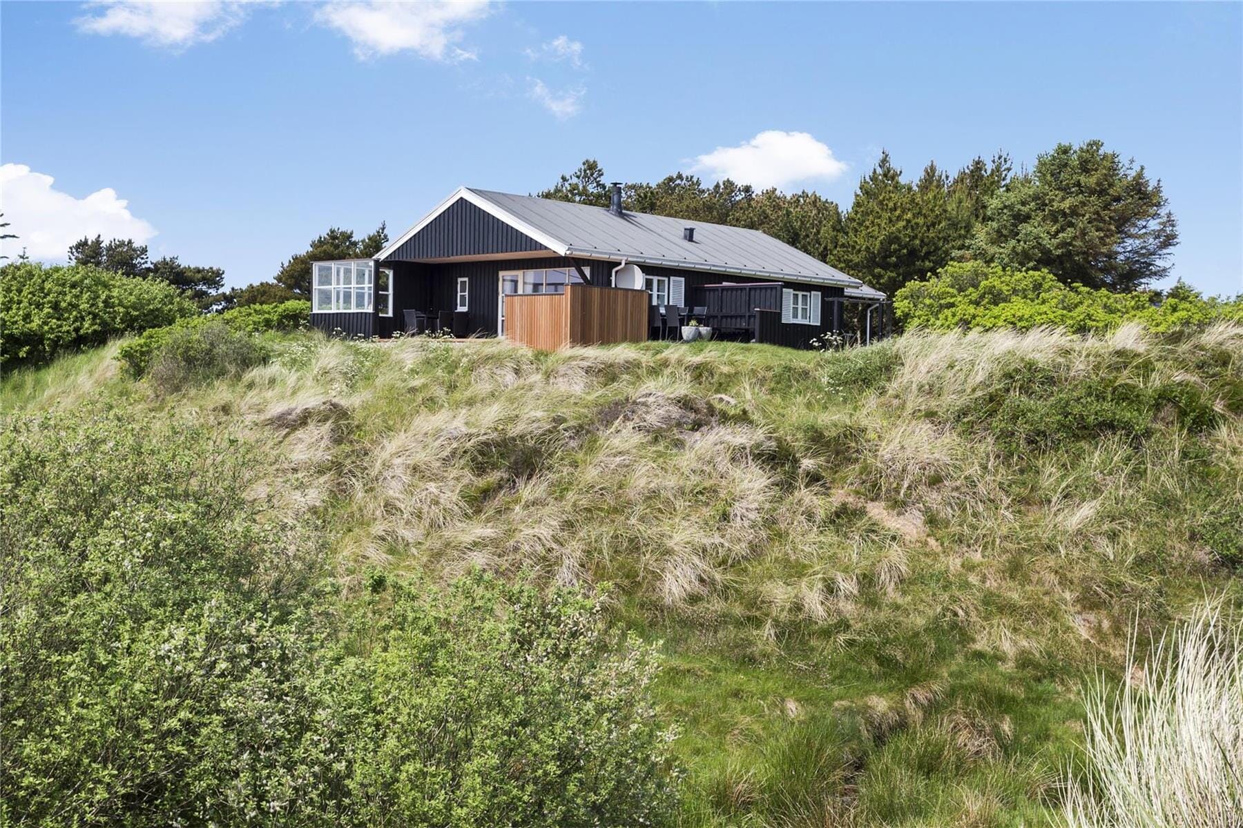 Det skønne terrassemiljø er uden tvivl et af sommerhusets højdepunkter. Her kan du nyde dagens første solstråler med morgenkaffen i hånden eller grille en lækker middag på de lune sommeraftener. Terrassen er rummelig og indbyder til afslapning i liggestolene, mens du lader blikket vandre ud over det smukke landskab. Den omkringliggende natur skaber en følelse af ro og privatliv, hvor du virkelig kan koble fra og nyde ferien i dit eget tempo. Hvis du er til friluftsliv, kan du tage en gåtur i området og opleve den rå og uspolerede natur, som kendetegner Thy.