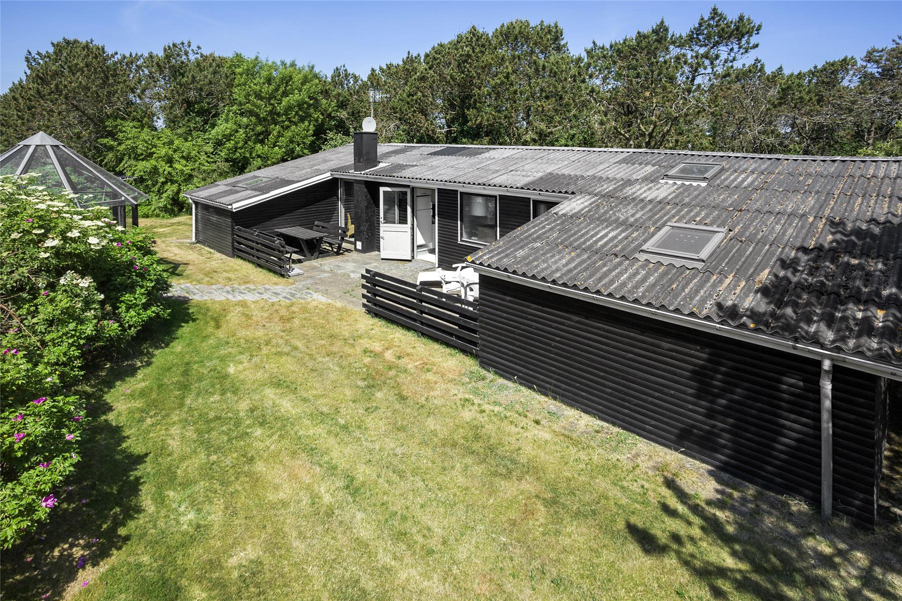 Udenfor finder du en skøn, sydvendt terrasse, hvor solen forkæler dig fra morgen til aften. Terrassen er ideel til morgenkaffe, frokoster i solens varme og grillaftener, hvor I kan nyde de lange, lyse sommeraftener. Den omkringliggende grund giver også plads til, at børn eller husdyr kan lege frit, da her er masser af luft og ro. Her kan I lægge hverdagens travlhed bag jer og lade naturens stilhed tage over.