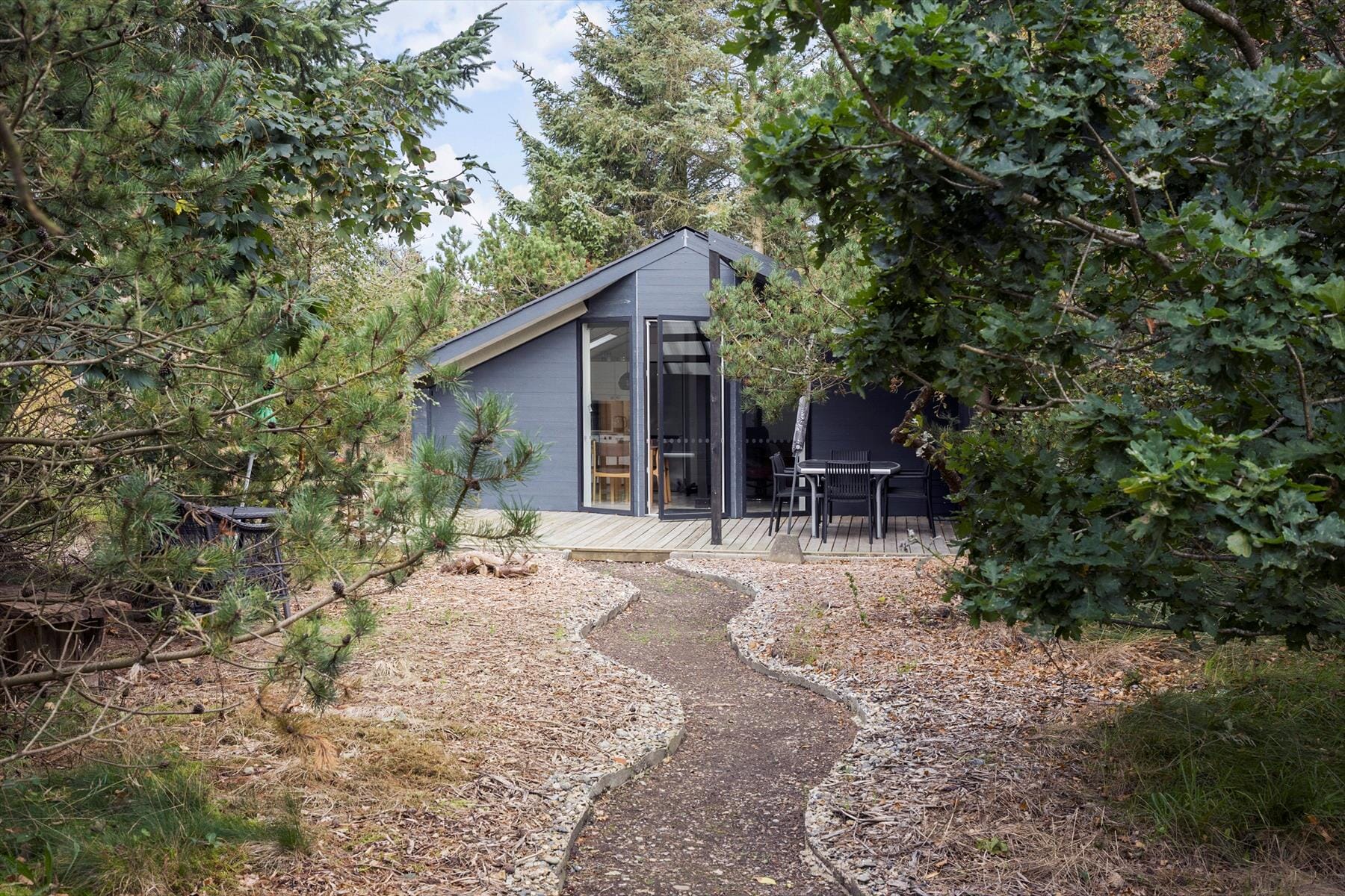 Fra sommerhusets stue har du direkte adgang til en stor og delvist overdækket træterrasse, der hurtigt kan blive din foretrukne opholdsplads, når vejret er lunt, og der er sommer i luften. Du og dine kære har gode havemøbler, en parasol og en grill til rådighed, så det er fristende at blive siddende og nyde driverlivet, lige fra dagens første kop kaffe og indtil tusmørket sænker sig efter et lækkert aftensmåltid. Naturgrundens høje træer giver dig fornemmelsen af at sidde midt i et skovbryn, og mon ikke der også er fuglesang fra oven til at forstærke den idylliske stemning.