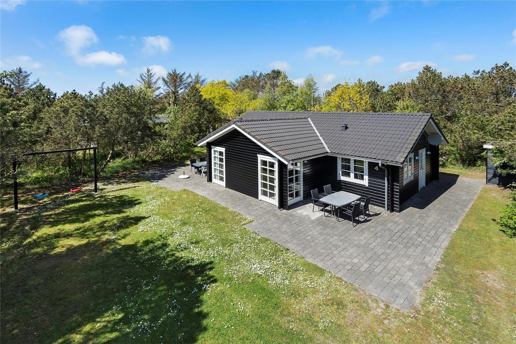 Sommerhuset ligger på en dejlig naturgrund, godt afskærmet af høje træer, som både sikrer privatlivets fred og skærmer helt af for vinden. Rundt om hele huset er en sammenhængende fliseterrasse, så man er sikker på at få sol hele dagen og også kan udnytte de lange, lune sommeraftener.