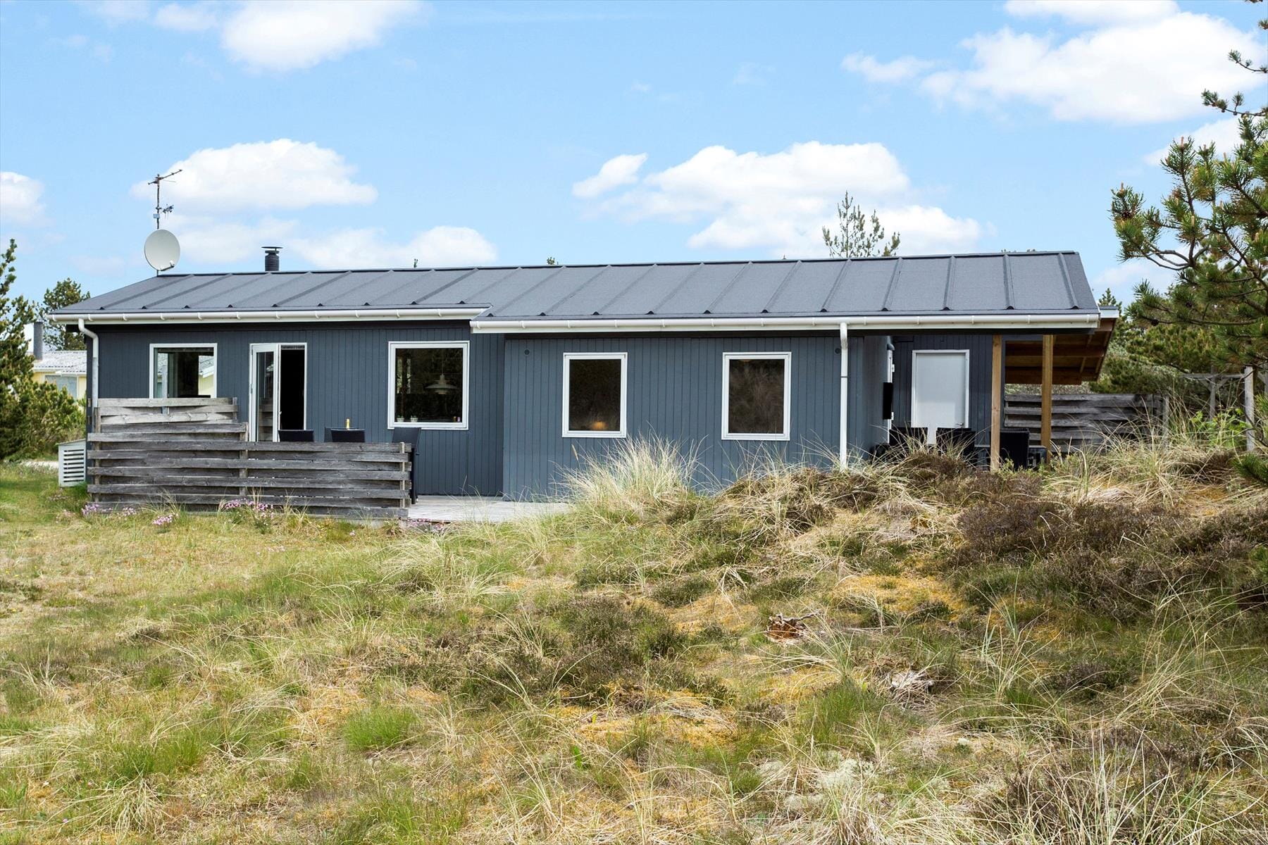 Udenfor sommerhuset åbner der sig et sandt fristed, hvor naturen træder direkte ind i din ferieoplevelse. Beliggende på en smuk klitgrund, kan du næsten mærke den blide brise fra havet og høre naturens egne lyde – fra fuglesang til den sagte hvislen fra vinden i klitplanterne. Her er udendørsområdet et ideelt sted til både leg og afslapning; forestil dig lange gåture barfodet i det bløde sand, afslappende stunder med en god bog i skyggen af de grønne træer, eller hyggelige aftener med grill og samvær under åben himmel. Den fredelige atmosfære og de naturskønne omgivelser giver dig muligheden for at lade tankerne flyve og finde ro i en travl hverdag. Dette er et sted, hvor hver solopgang og solnedgang maler himlen i farver, der får både sjæl og sanser til at vågne op.