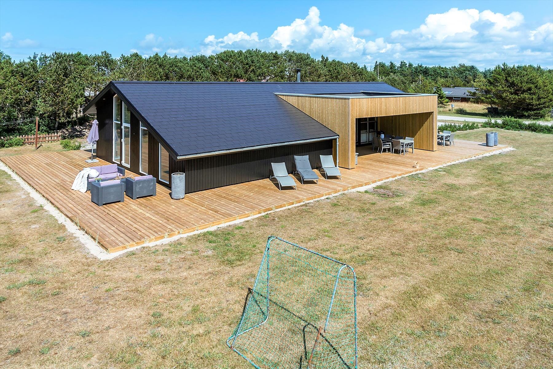Der er også god plads til leg og afslapning ude i det fri på den store grund. På græsplænen kan hele familien spille fodbold eller andre havespil, og hvis du trænger til en tilbagelænet pause, er det skønt at kunne trække sig tilbage på den lækre træterrasse, der breder sig rundt om huset. Det meste af terrassemiljøet er åbent, men der også et overdækket areal, der fungerer som den perfekte overgang mellem stuen og udearealet – for eksempel om aftenen, hvis I vil sidde i det fri, men samtidig i ly for dug og i læ for brisen fra havet.