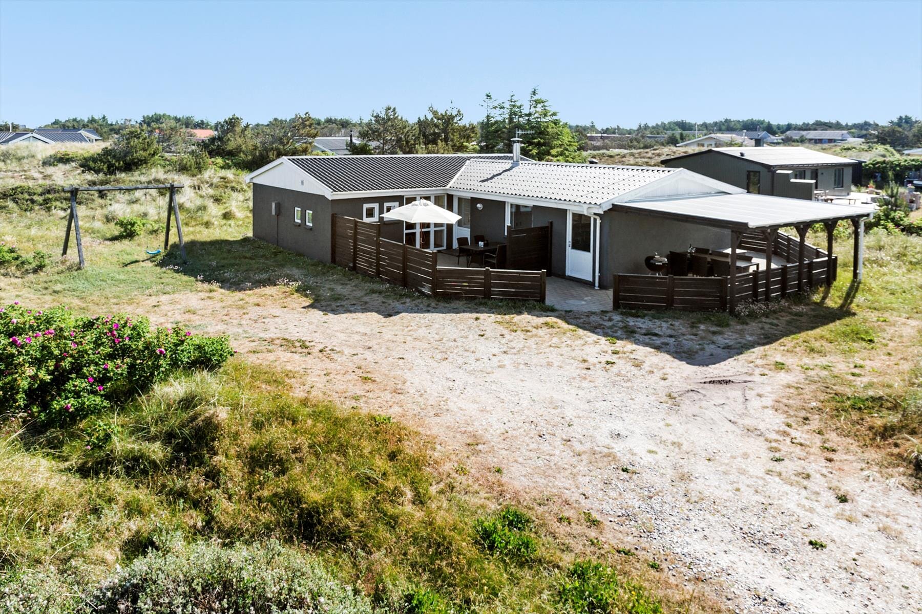 Den store grund omkring sommerhuset giver plads til både leg og afslapning. De yngste kan boltre sig i klitterne, mens de voksne finder ro på terrassen med en god bog og en kop kaffe. Med husets hundevenlige politik kan familiens firbenede ven også lege på græsset eller tage med på eventyr. Når aftenen falder på, inviterer terrassen til hyggelige grillaftener under den klare himmel, hvor duften af grillmad blander sig med den friske havluft fra Vesterhavet, der ligger i kort gåafstand fra sommerhuset.