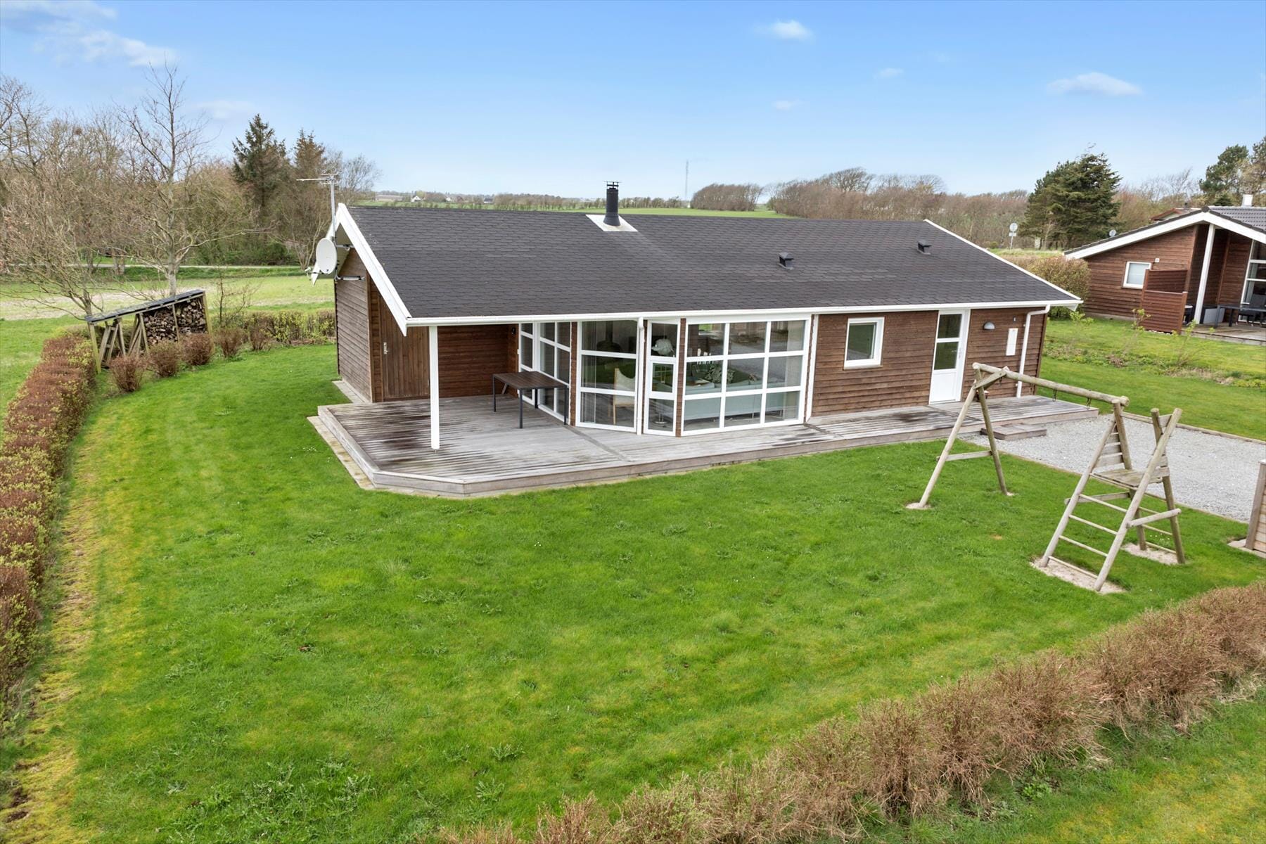 Udendørs byder huset på en stor terrasse, hvor du kan slappe af og nyde den fantastiske udsigt over det naturskønne landskab. Terrassen er det ideelle sted at starte morgenen med en kop kaffe, mens du ser solen stige op over horisonten. Senere kan du tage plads under åben himmel og mærke roen sprede sig, mens du nyder en kølig drik i solen. Uanset om du vælger at slappe af i liggestolen eller samles til måltider på terrassen, vil den smukke udsigt og den rolige beliggenhed skabe den perfekte baggrund for hyggelige ferieminder.