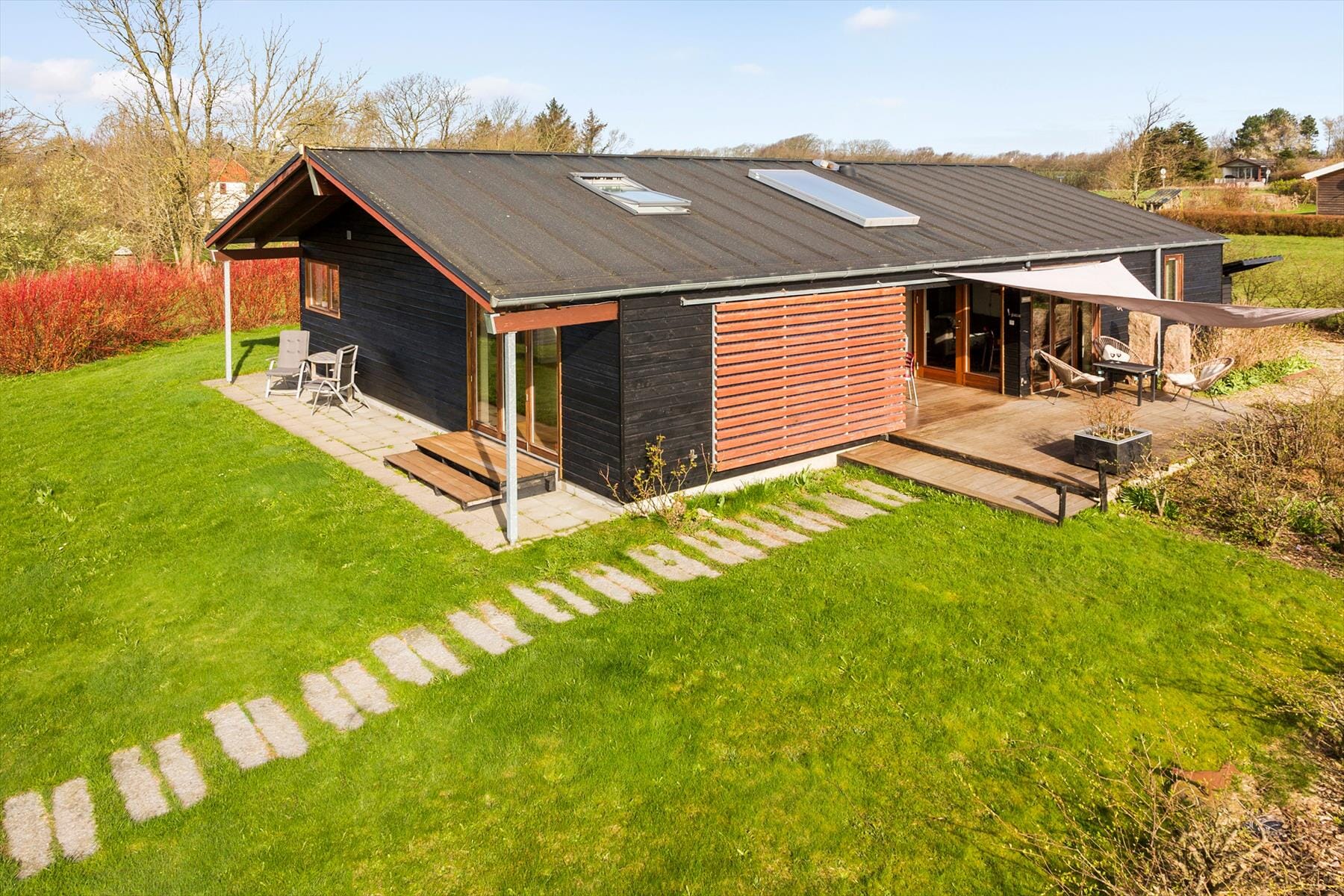 Huset er egnet til helårsbrug og har et lavt energiforbrug i kraft af solceller og god isolering.
