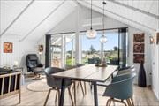 Når du træder indenfor i dette hyggelige sommerhus, bliver du straks mødt af en varm og indbydende atmosfære. Stuen er indrettet med komfortable møbler, der indbyder til afslappende stunder med en god bog eller en brætspilsaften med familien. Brændeovnen står centralt i rummet og spreder en behagelig varme på kølige dage, mens flammernes sagte knitren skaber den helt rette stemning. Køkkenet er praktisk og veludstyret, så du nemt kan tilberede lækre måltider, som kan nydes ved spisebordet med udsigt til den omkringliggende natur. Her er der plads til fire personer, hvilket gør sommerhuset ideelt til en lille familie eller et par, der ønsker en romantisk ferie tæt på hav og klitlandskaber.