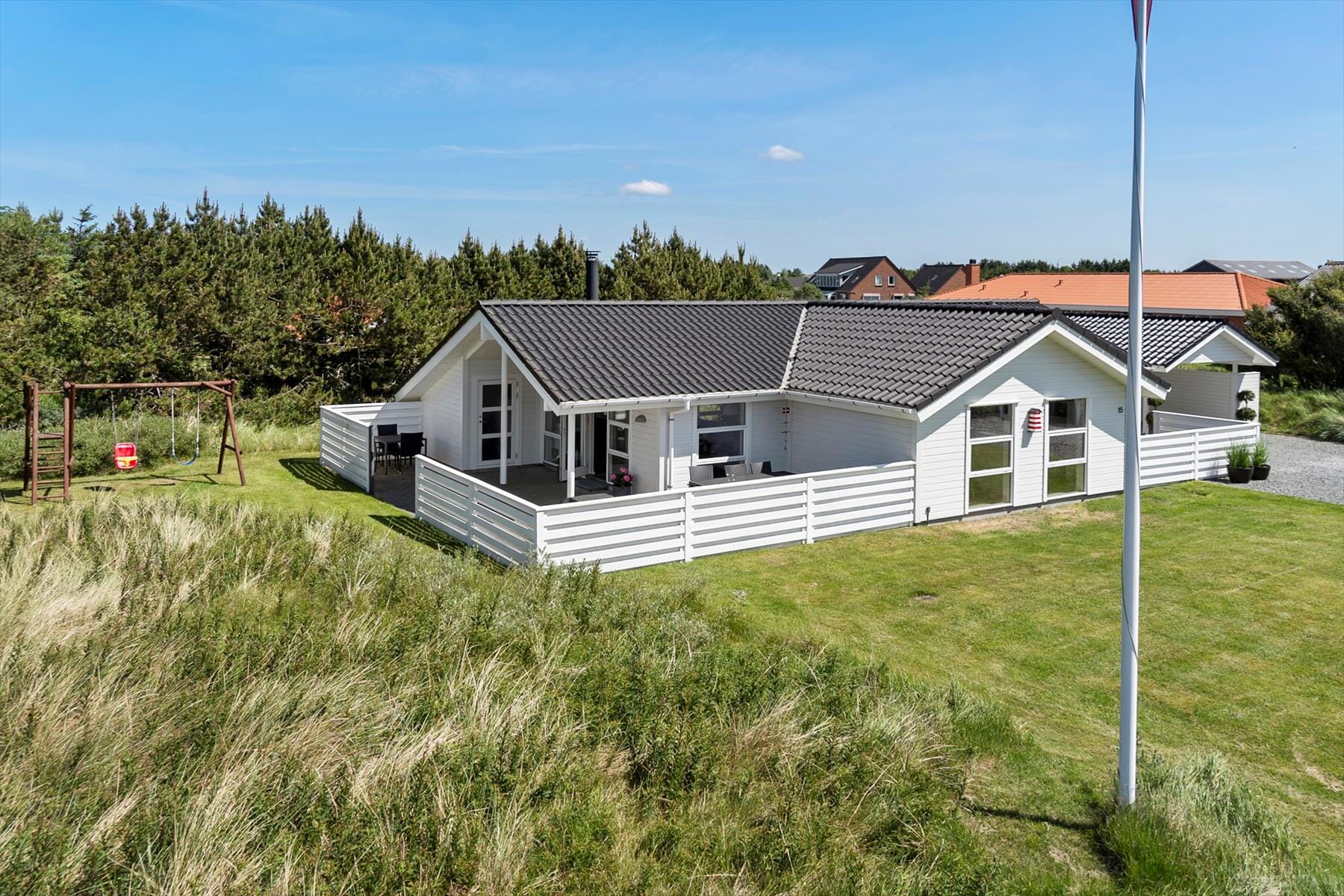 Selv om det indre af sommerhuset opfordrer til hygge og afslapning, er udelivet mindst lige så fristende. Fra stuen kan du træde direkte ud på en skøn terrasse, hvor frokostbordet i sommersolen kan blive dagens højdepunkt, og hvor du kan lade dig omfavne af den friske, vestjyske havluft. De omkringliggende klitlandskaber og den rolige atmosfære vidner om, at du her befinder dig i et af Danmarks mest naturskønne områder. Haven indbyder til leg og latter; mens børnene boltrer sig i græsset, kan de voksne nyde en stille stund med en kop kaffe og lade tankerne vandre. Med en enkel gang- eller cykeltur når du lynhurtigt ud i klitterne, hvor du kan lade vinden i håret og smagen af salt på læberne minde dig om, hvor tæt du er på det brusende Vesterhav. Når aftenroen sænker sig, er terrassen det perfekte sted at samle alle til et grillmåltid i solnedgangens bløde skær, inden I trækker jer tilbage til varmen indendørs.