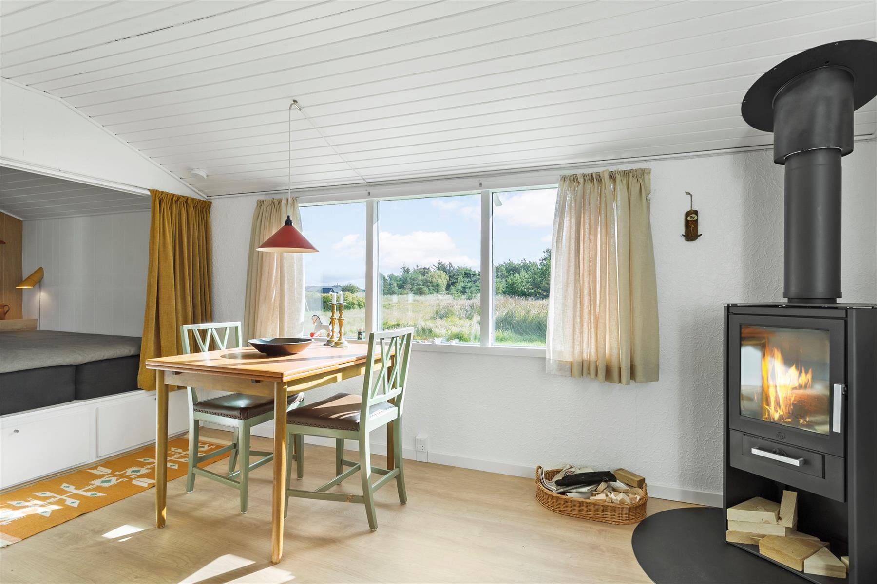 I dette hyggelige sommerhus bliver du mødt af en varm og afslappet stemning. Her er plads til fire personer, og indretningen er designet med tanke på ro og samvær. Stuen byder på et hjertevarmt samlingspunkt med en knitrende brændeovn og energivenlig varmepumpe, der skaber komfort året rundt. Forestil dig at tilbringe aftener foran ilden, mens du lader tiden stå stille og blot nyder den særlige ro, der kun findes i et sommerhus. Køkkenet er åbent og funktionelt, så du nemt kan tilberede måltider, der kan nydes ved spisebordet eller i stuen med udsigt til naturen udenfor.