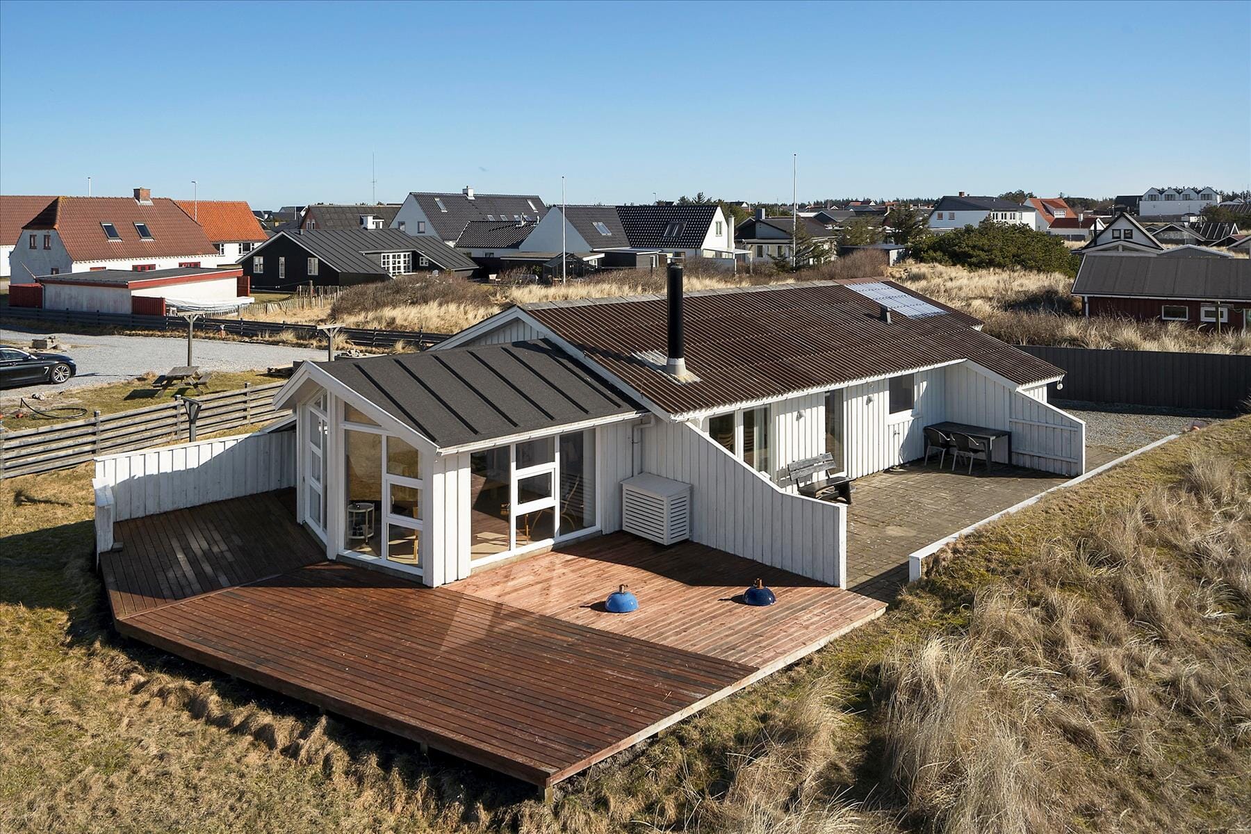 Udenfor venter en stor og skøn terrasse, hvor ferielivet virkelig kan nydes. Her kan du starte dagen med en kop kaffe i morgensolen og lade dagens planer tage form i det rolige omgivelser. Når solen står højest på himlen, er terrassen det perfekte sted til en lang frokost i det fri, og om aftenen kan I tænde op i grillen og nyde et godt måltid under åben himmel. Her er plads til både afslapning og leg, og terrassen bliver hurtigt et naturligt samlingspunkt i løbet af ferien. Har du brug for et øjebliks ro, kan du læne dig tilbage i en liggestol og lytte til fuglene, mens du nyder den friske havluft.
