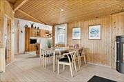 Indenfor mødes du af et lyst og venligt sommerhus, der straks inviterer til hygge og afslapning. Den rummelige stue, der er kombineret med det åbne køkken, skaber en dejlig atmosfære, hvor hele familien kan samles. Store vinduer lader dagslyset strømme ind og giver udsigt til den grønne natur udenfor. Sommerhusets værelser er komfortable og ideelle til lange morgener, hvor du kan vågne langsomt op til feriedagens mange muligheder. Her kan du finde ro og nyde alle hjemmets bekvemmeligheder.