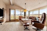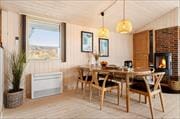 Når du træder ind ad døren, mærker du straks den behagelige atmosfære, som huset emmer af. De lyse rum og den enkle, venlige indretning får sommerhuset til at føles imødekommende og hjemligt – som et sted, hvor du hurtigt falder til. Stuen er husets naturlige samlingspunkt, hvor brændeovnen skaber stemning på kølige dage, og hvor du kan sætte dig i sofaen med en bog eller bare nyde roen efter en lang gåtur langs stranden. Køkkenet ligger praktisk i åben forbindelse med opholdsrummet, så du kan være med i snakken, mens du laver morgenkaffen. Badeværelset er af ældre dato og bærer præg af sin tid – men det har alt, hvad der skal til for en afslappet ferie.