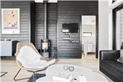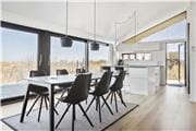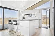 Indenfor mødes du af en lys og rummelig indretning med loft til kip og store gulv-til-loft-vinduer, der lader dagslyset strømme ind og skaber en flydende overgang mellem inde og ude. Den sorte træfacade går igen indvendigt og tilfører en eksklusiv og varm atmosfære til rummene. Stuen og køkkenet ligger i åben forbindelse og er det naturlige samlingspunkt for afslappende stunder med familien eller vennerne – måske foran brændeovnen med en god bog eller over et fælles måltid ved spisebordet. De komfortable soveværelser og det moderne badeværelse sikrer, at du har alt, hvad du behøver for at lade op og nyde ferien.