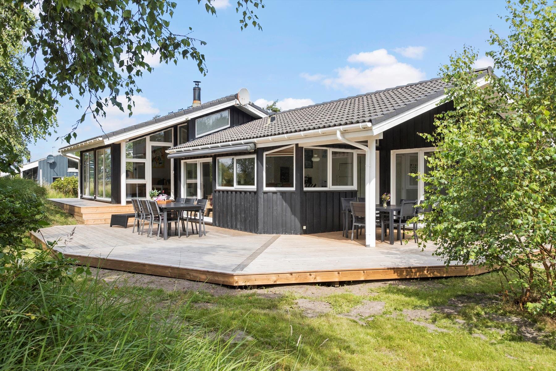 Sommerhuset ligger på en rummelig grund med masser af plads til at nyde de naturskønne omgivelser. Den store terrasse indbyder til hyggelige stunder under åben himmel – fra morgenkaffe i solen til lækre gril lmiddage, mens aftenen falder på. Haven er en oase af ro og plads, hvor børn kan lege frit, og de voksne kan finde en fredelig krog til at læse en bog eller bare nyde fuglesangen. De omkransende træer giver en følelse af privatliv og harmoni, og her kan du virkelig koble af og lade naturen omfavne dig.