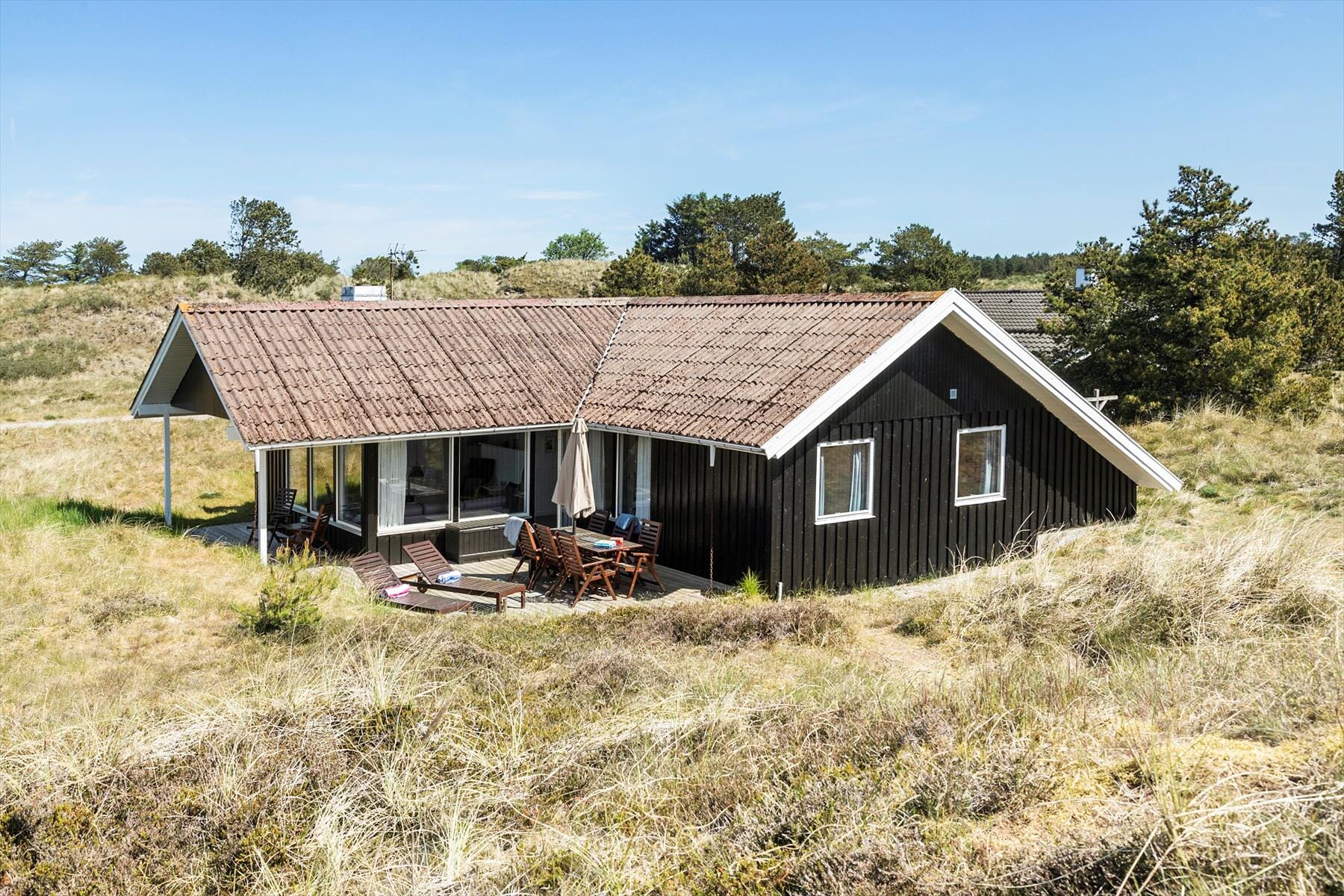 De udendørs omgivelser er en drøm for naturelskere. Sommerhuset ligger på en stor naturgrund, hvor du kan høre fuglesang og nyde roen fra de omkringliggende træer. På terrassen kan du starte dagen med morgenkaffe i solen og afslutte den med aftensmad fra grillen under den åbne himmel. Med havemøbler og liggestole er der rig mulighed for afslapning, mens børnene kan boltre sig på græsplænen og udforske de små hjørner af grunden. Den rolige beliggenhed sikrer fred og privatliv, samtidig med at du er tæt på alt det bedste, Tversted har at byde på.