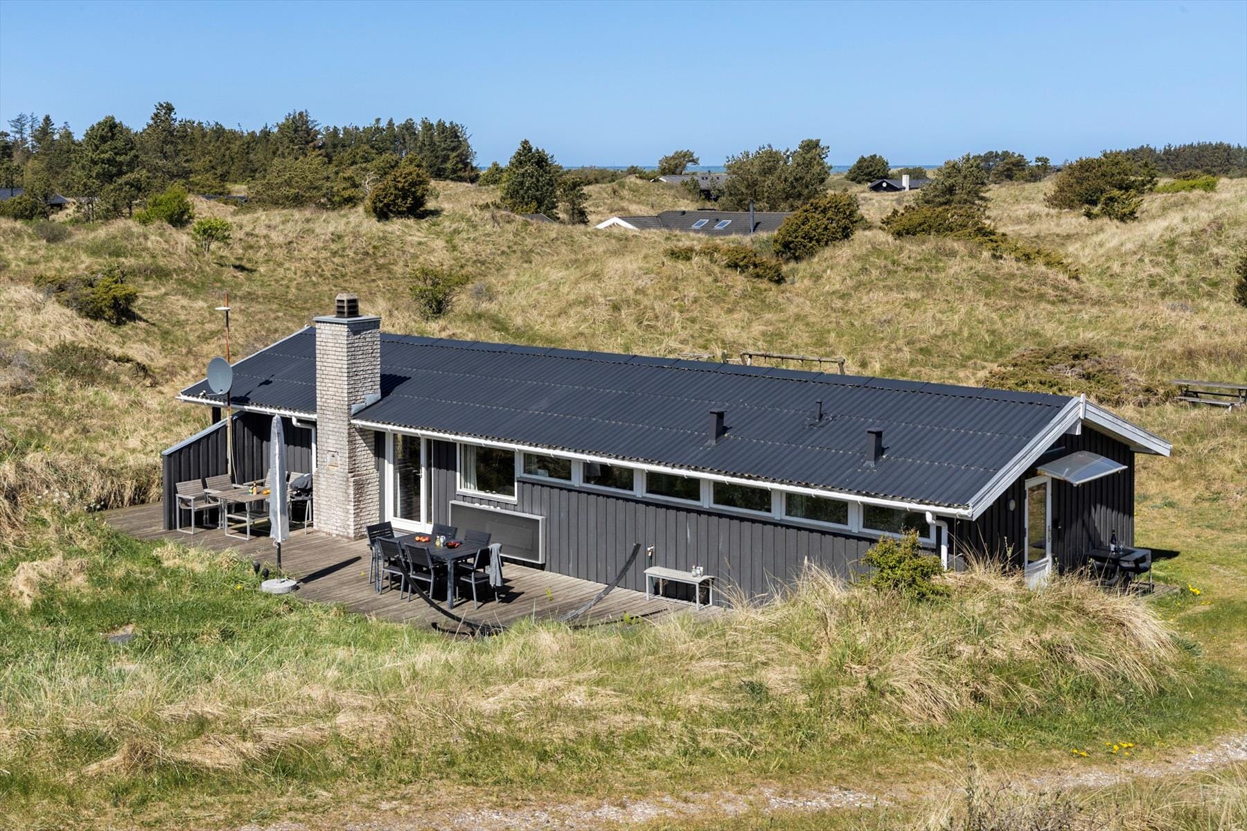 Sommerhusets ugenert terrasse er et fantastisk sted at nyde dagens måltider, lade børnene lege frit eller blot slappe af i en liggestol med en god bog. Terrassen omkranses af den frodige naturgrund, som giver en skøn fornemmelse af privatliv. Her kan du lade dig opsluge af fuglesangen og den friske havluft, mens solen bevæger sig hen over himlen. Hvis du er mere til aktive oplevelser, er der rig mulighed for at udforske de nærliggende skovområder og stier.