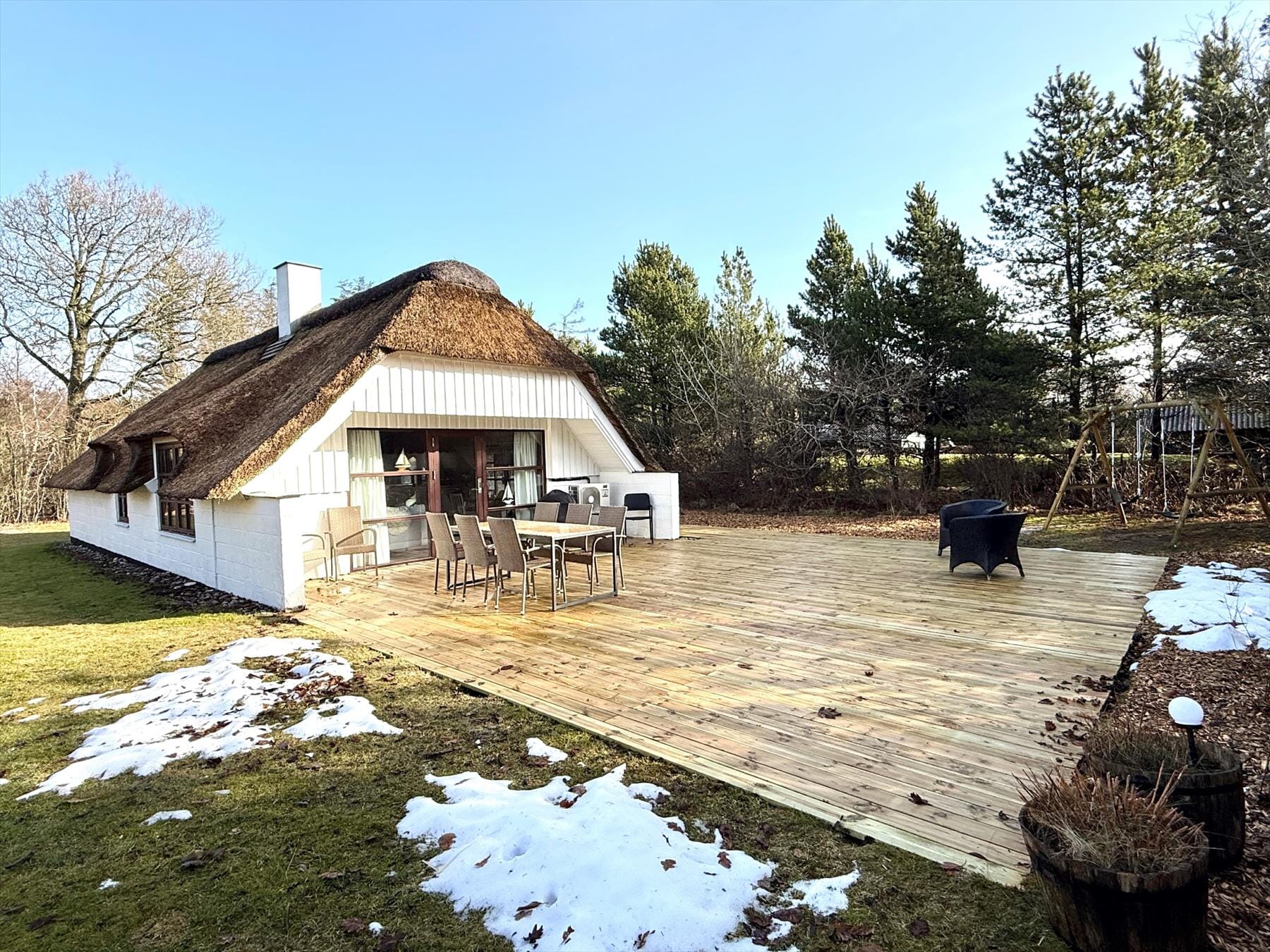 Den store træterrasse smyger sig rundt om huset og giver jer altid mulighed for at finde et læhjørne – med solen i ansigtet og kaffen i hånden. Ved indgangen er der anlagt et lille klitlandskab, som både skaber læ og en følelse af privatliv. De høje træer omkring huset gør resten.