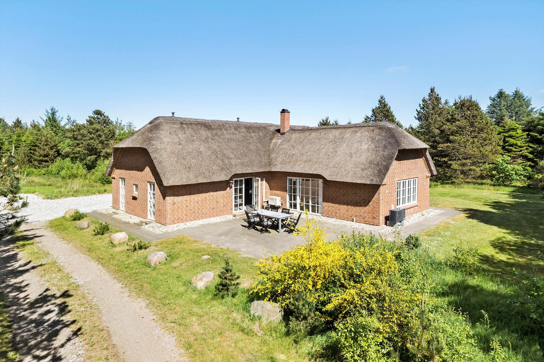 Huset har et af de skønneste udeområder, og på den store grund er en stor del udlagt til naturen med lyng og natur græs, her vil I have god mulighed for at se rådyr, harer og andet vildt der kommer forbi. Trænger I en dag til et aktivt pust er der rig mulighed for boldspil på den dejlige græsplæne. Sæt jer på en af de 3 store terrasser og nyde den herlige natur der er på grunden, og se solop- og nedgangen som kan ses fra det meste af grunden.