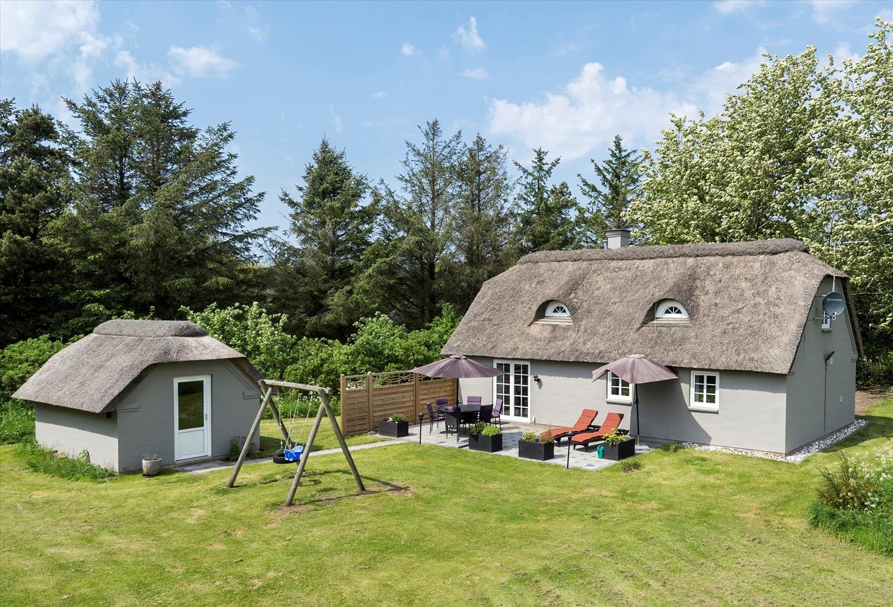 Den store naturgrund opfordrer til leg og sjov for hele familien, tag et spil bold eller en omgang tag fat inden I slår jer ned på den hyggelige terrasse, med de gode læ forhold, her kan I nyde solens stråler der blidt varmer jeres hud og giver en smuk sommerglød. For de mindste er der opsat et gyngestativ der opfordrer til mange timer på gyngen, imens kan I nyde sommerens varme på en af de flotte liggestole.