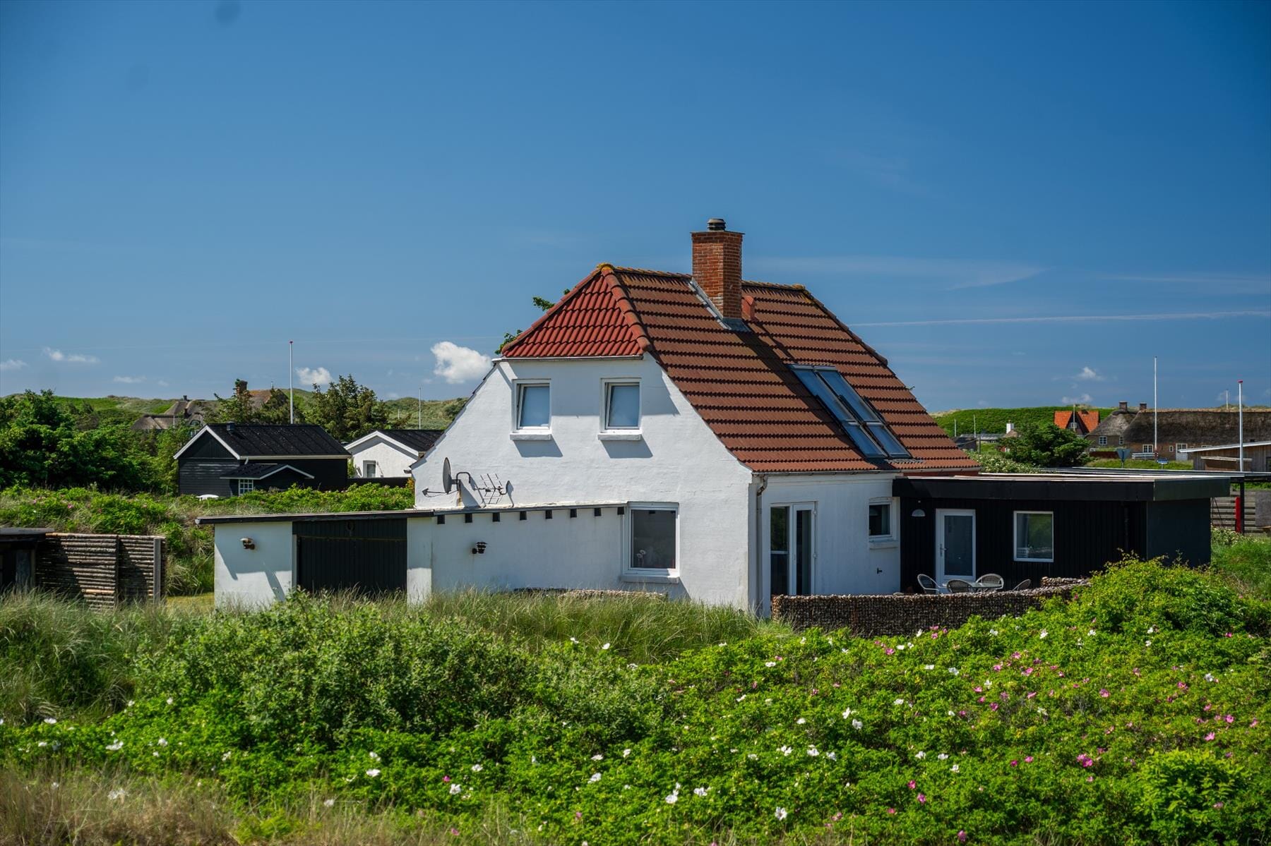 På den anden side af huset ligger en terrasse, hvor udsigten over fjorden og klitterne virkelig kommer til sin ret. Her er det oplagt at starte dagen med morgenkaffe eller afslutte den med et glas vin, mens solen går ned over landskabet.