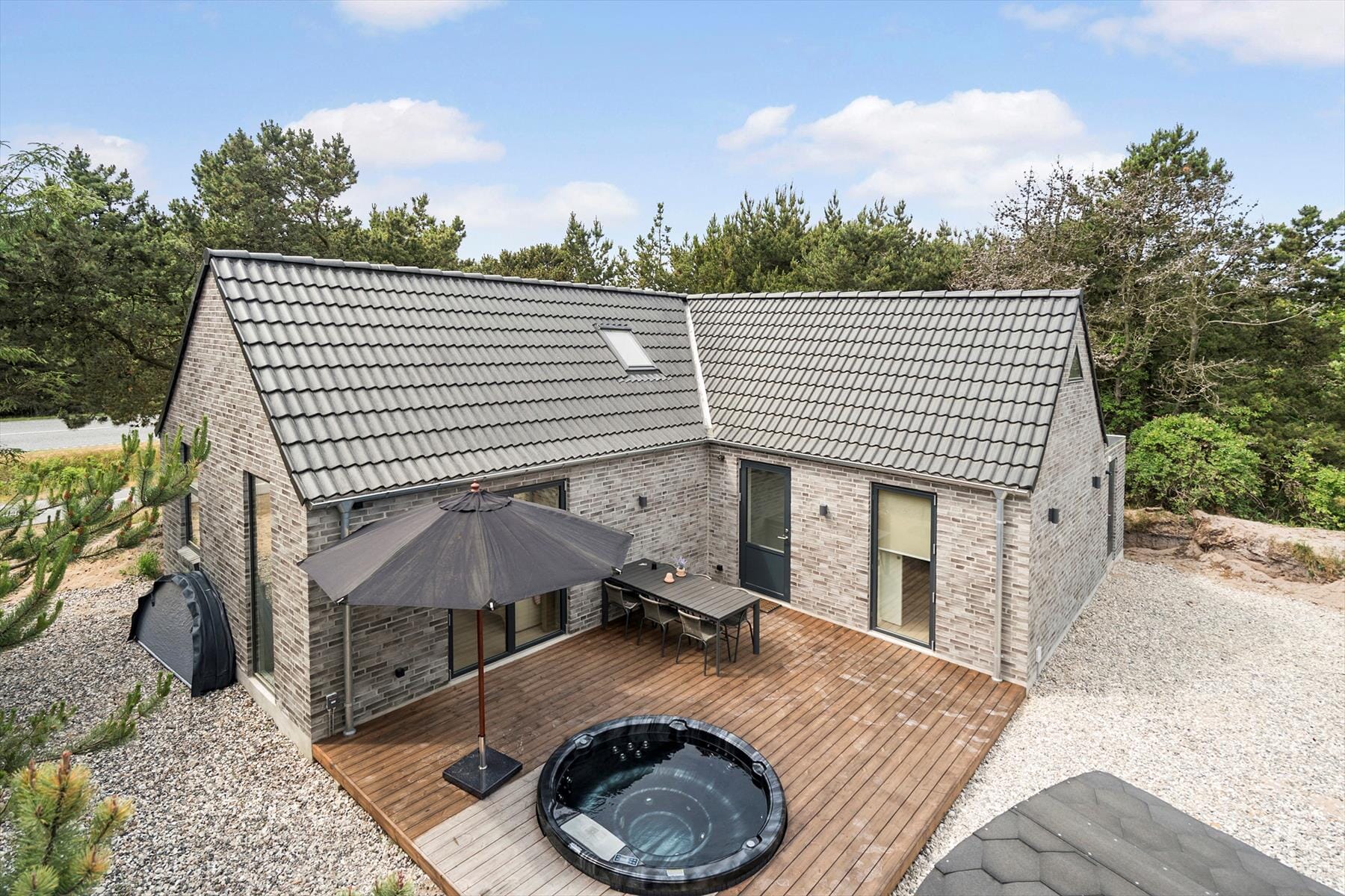 Forestil jer en ferie omgivet af fred, fuglefløjt og duften af hede og hav – jeres eget fristed midt i naturen! Dette skønne feriehus ligger på en smuk og ugeneret naturgrund, hvor I virkelig kan trække stikket og nyde livet i fulde drag. Udenfor venter en stor, solrig træterrasse, der byder på ren forkælelse: Forestil jer at starte dagen med et morgenbad i den udendørs jacuzzi, tage et forfriskende brusebad under åben himmel eller slutte dagen af med en afslappende tur i jeres egen sauna. Havemøbler og liggestole inviterer til lange, dovne eftermiddage med en god bog eller et glas vin i hånden, og grillen står klar til hyggelige sommeraftener under åben himmel. Få meter fra huset finder I en cykelsti, der fører jer direkte ud i det fantastiske landskab – hvad enten I vil til stranden, på opdagelse i området eller bare nyde en rolig cykeltur.