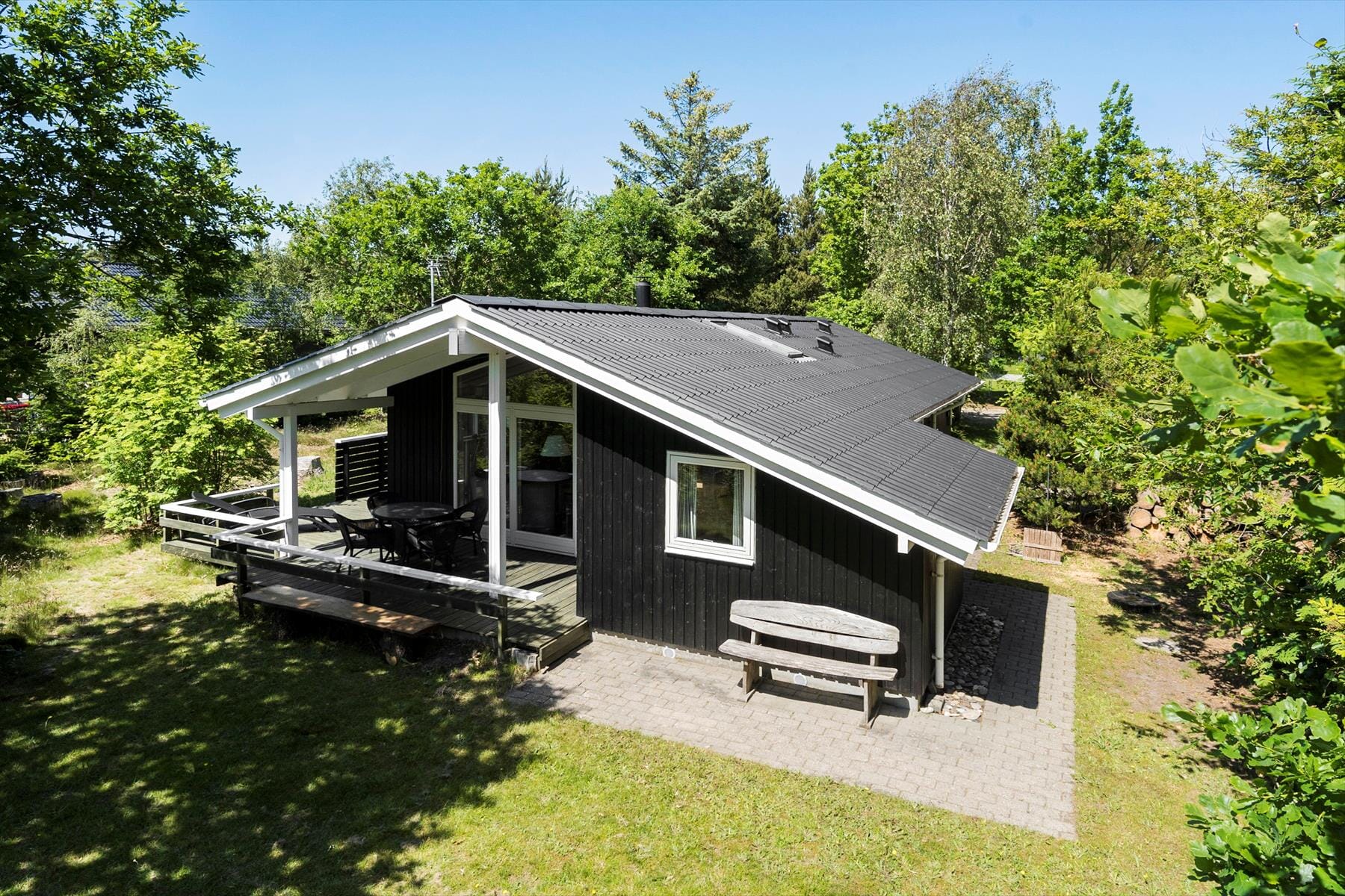 Træd ud på den overdækkende terrasse direkte fra husets stue, hvor I kan nyde en dejlig grillmiddag sammen med hele familien, tage morgenmaden med ud, og nyde udsigten over haven. Træerne omringer haven som en skøn skovoase, her kan I nyde solens stråler på græsset, og I kan trække jer tilbage, og finde en skyggeplads, når der er behov for det.