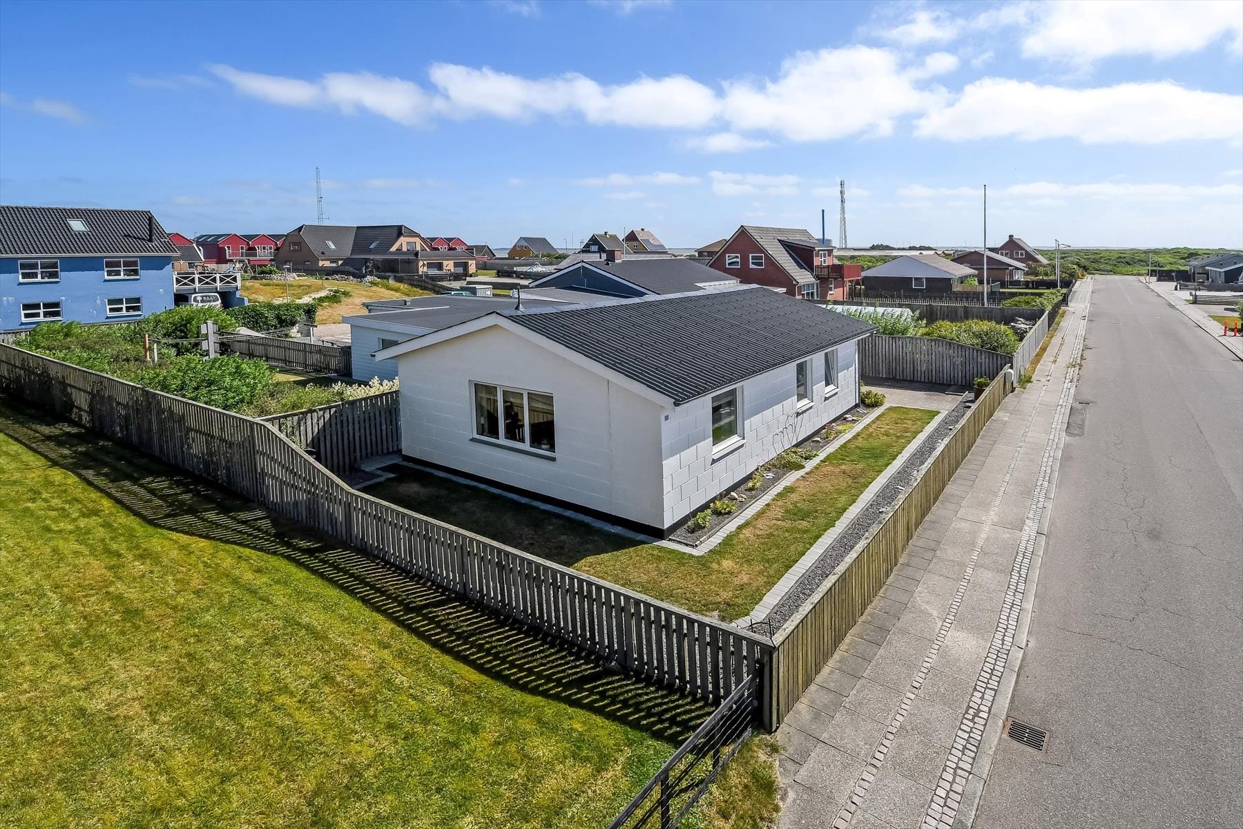 Fra køkkenet kommer I direkte ud på terrassen og i den lukkede have, hvor der er god plads til leg og afslapning. Her kan børnene spille bold eller lege fangeleg, mens de voksne nyder solen og den friske, salte havluft. Den dejlige terrasse indbyder til hyggelige eftermiddage med et glas vin, snakke om dagens oplevelser og stille aftener under åben himmel. Når solen går ned, forvandler himlen sig til en palet af røde og orange nuancer – den perfekte baggrund til et måltid i det fri. I det store udhus er der plads til både cykler og fiskegrej, så alt er klar til jeres næste tur ud i naturen.