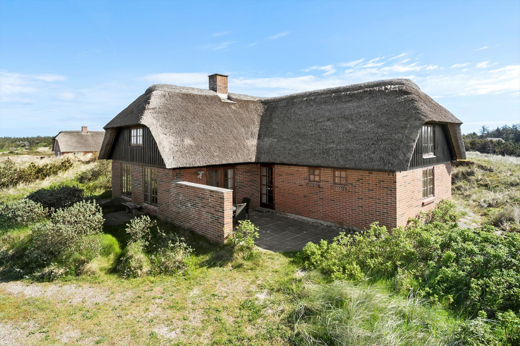 Nyd den fantastiske panoramaudsigt til klitterne der er fra den store naturgrund, her kan I nyde de mange solskinstimer udendørs. Tag morgenkaffen med udenfor og nyd den på den syd-østvendte terrasse med gode læ forhold, her kan I beundre den smukke natur imens solen langsomt stiger op på himlen og skaber et væld af orangerøde nuancer, og nyd hvordan fuglene nænsomt synger dagen ind. Den store terrasse kalder på lune sommeraftner med et glas vin i hånden imens I beundrer den smukke solnedgang bag klitterne.