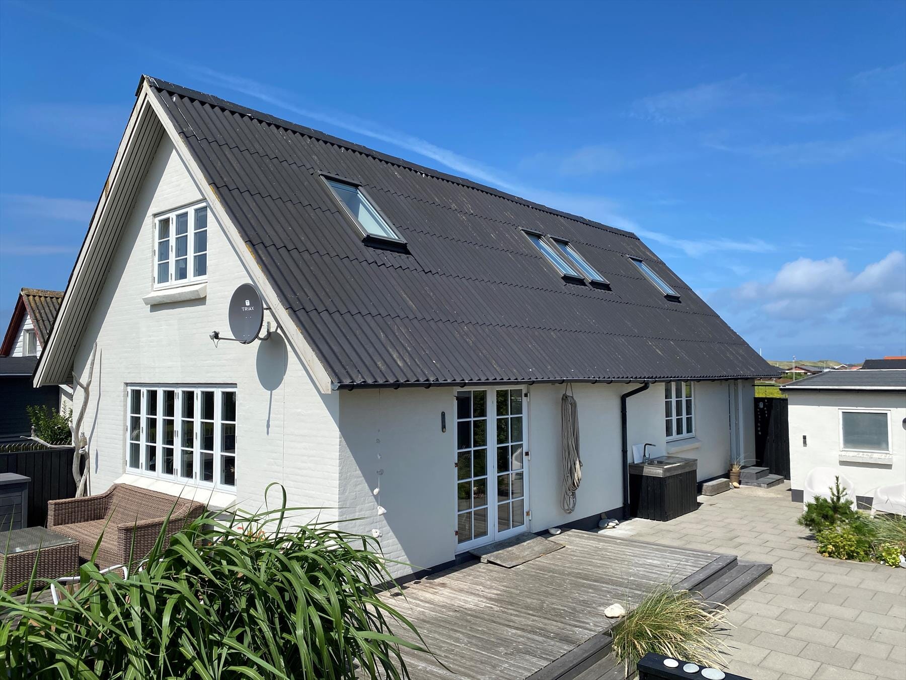 Stå op til en fantastisk solrig dag og begiv dig ud på den skønne terrasse og sæt dig i de gode havemøbler med en kop kaffe i hænderne og se solen langsomt stå op, imens fuglene synger dagen ind og den friske Vesterhavsluft kilder din næse. Den indhegnede grund byder på en dejlig stor gårdhave i samhørighed med haven, som gør den ideel til tryg leg for hele familien, da hunde og børn kan færdes frit og uden bekymringer. I de mange hyggekroge kan man i ro og mag nyde solens stråler og finde læ det meste af dagen. Trænger man til nedkøling, går man blot en tur ind under udendørsbruseren. Huset ligger så tæt på havet, at man de fleste dage, kan høre havet og bølgerne slå. Ved fiskerensebordet kan man stå og rengøre sine friskfangede fisk mens man snakker med familien og i skuret hvor der findes en ekstra fryser til fangsten, er det også muligt at henstille evt. medbragt lystfiskegrej.