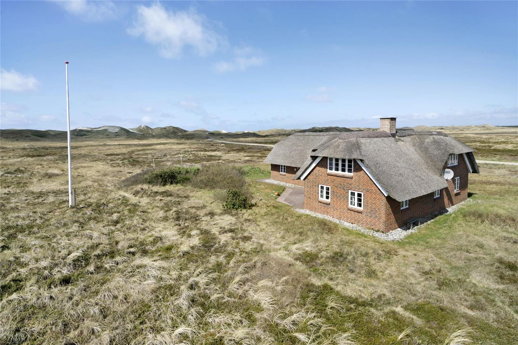Når I bevæger jer udenfor, bliver I mødt af en panoramaudsigt, der nærmest tager pusten fra jer. Det bakkede klitlandskab, som strækker sig så langt øjet rækker, indbyder til fordybelse og nærvær. Huset ligger på en stor, kuperet naturgrund, delvist dækket af lyng, som blomstrer i flotte farver og tilføjer landskabet en særlig charme. Sæt jer på terrassen med en kop kaffe eller et glas vin, og nyd stilheden, fuglesangen og den friske, salte luft fra havet. Når solen begynder at gå ned, forvandler himlen sig til et farvespil af blå, orange og gyldne nuancer, som spejler sig i klitterne og giver jer en udsigt, I sent vil glemme. Her kan I virkelig koble af, finde hinanden og bare være til stede i nuet. Uanset om I er til ro og stilhed eller leg og aktivitet i det fri, giver omgivelserne jer mulighed for begge dele – og alt derimellem.
