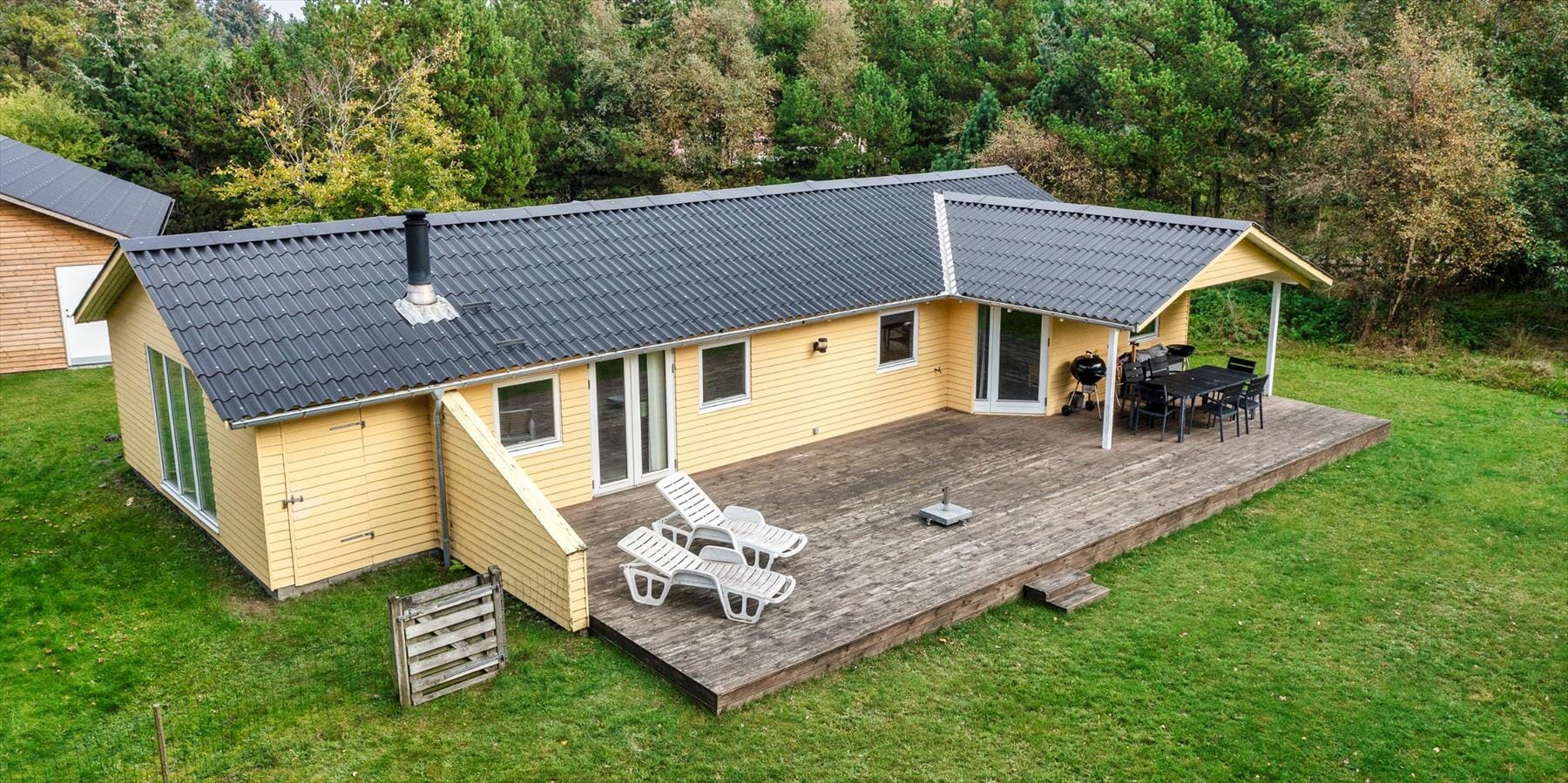 Hus-ID: VE458Smukt feriehus beliggende på en stor græsgrund, omgivet af træer og buske. Feriehuset er indrettet til 6 personer. Stranden ligger ca. 2 km fra huset. Der er en hyggelig opholdsstue med fjernsyn. Det tyske tv-program modtages via Stofa, så der er kun 5–8 kanaler tilgængelige. I spiseområdet står en kamin, som opvarmer hele rummet og også bidrager varme til stue- og køkkenområdet. Spisepladsen er placeret overfor køkkenet. Køkkenet er enkelt indrettet og har komfur med kogeplader, ovn, opvaskemaskine, mikroovn og køle-/fryseskab. Vaskemaskinen er også placeret i køkkenet. Det flisebelagte badeværelse har toilet, håndvask, bruser og sauna. Der er i alt tre soveværelser: ét med dobbeltseng og to med hver to enkeltsenge. Til de små gæster er der et gyngestativ på grunden. Hvis det skulle regne, kan I fortsætte grillaftenen i tørvejr, da en del af terrassen er overdækket. Feriehuset har internetadgang (Wi‑Fi). Der er varmepumpe i huset, hvilket kan være med til at reducere strømudgifterne, da varmepumpen er energieffektiv. Rygning indendørs er ikke tilladt. Maks. ét kæledyr er tilladt, men dyret må ikke efterlades alene i huset efter ejerens ønske. Feriehuset er bygget i 1966 og renoveret i 1998.